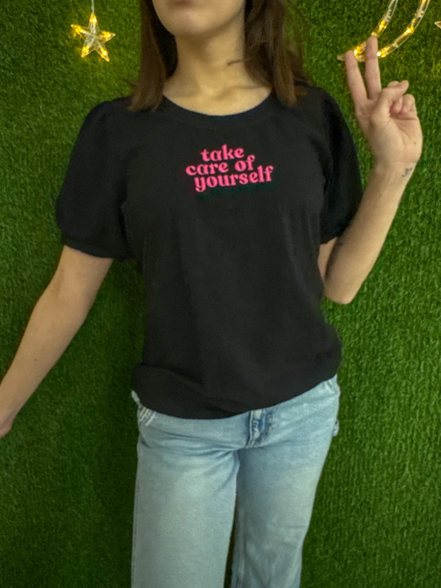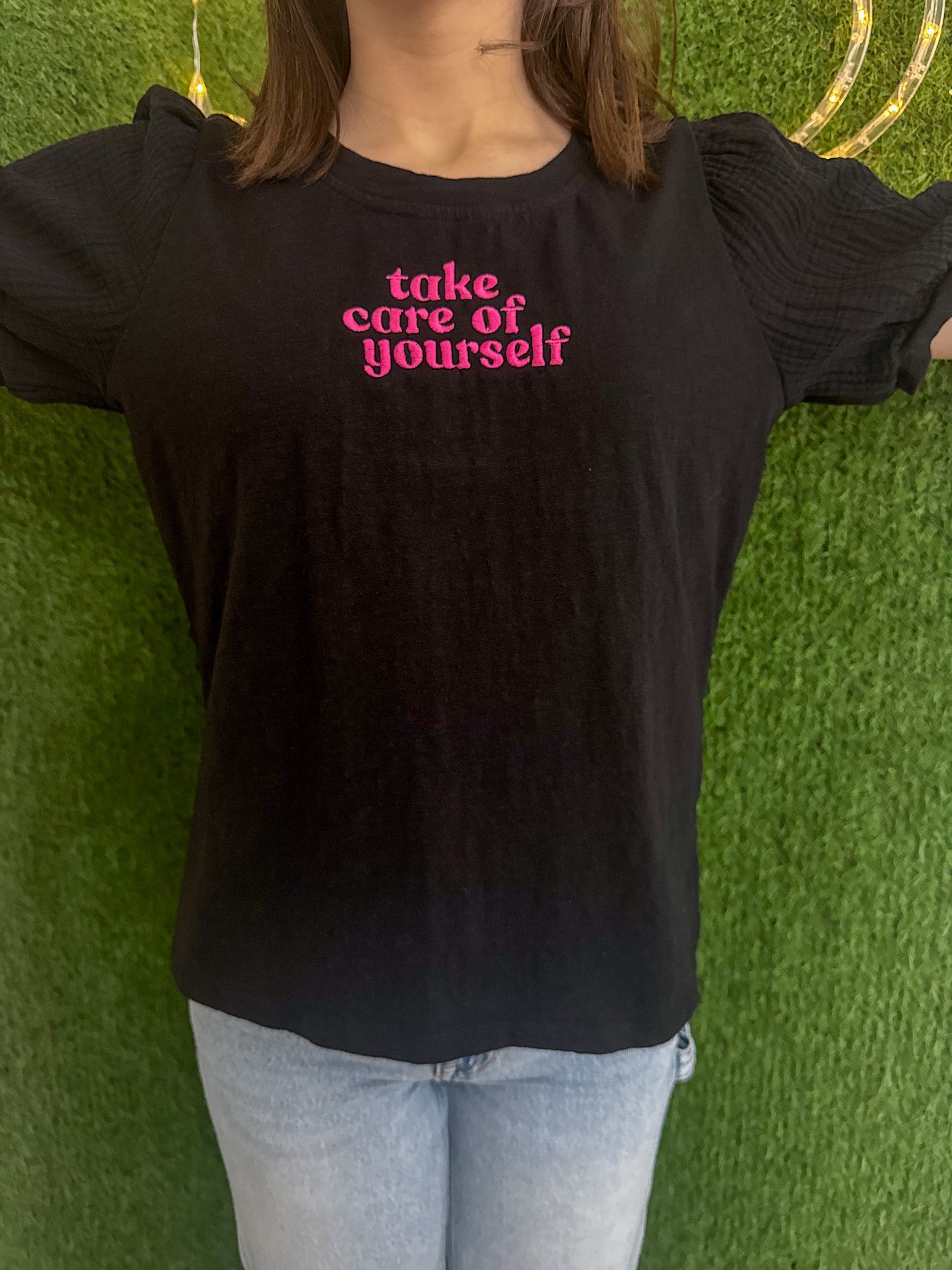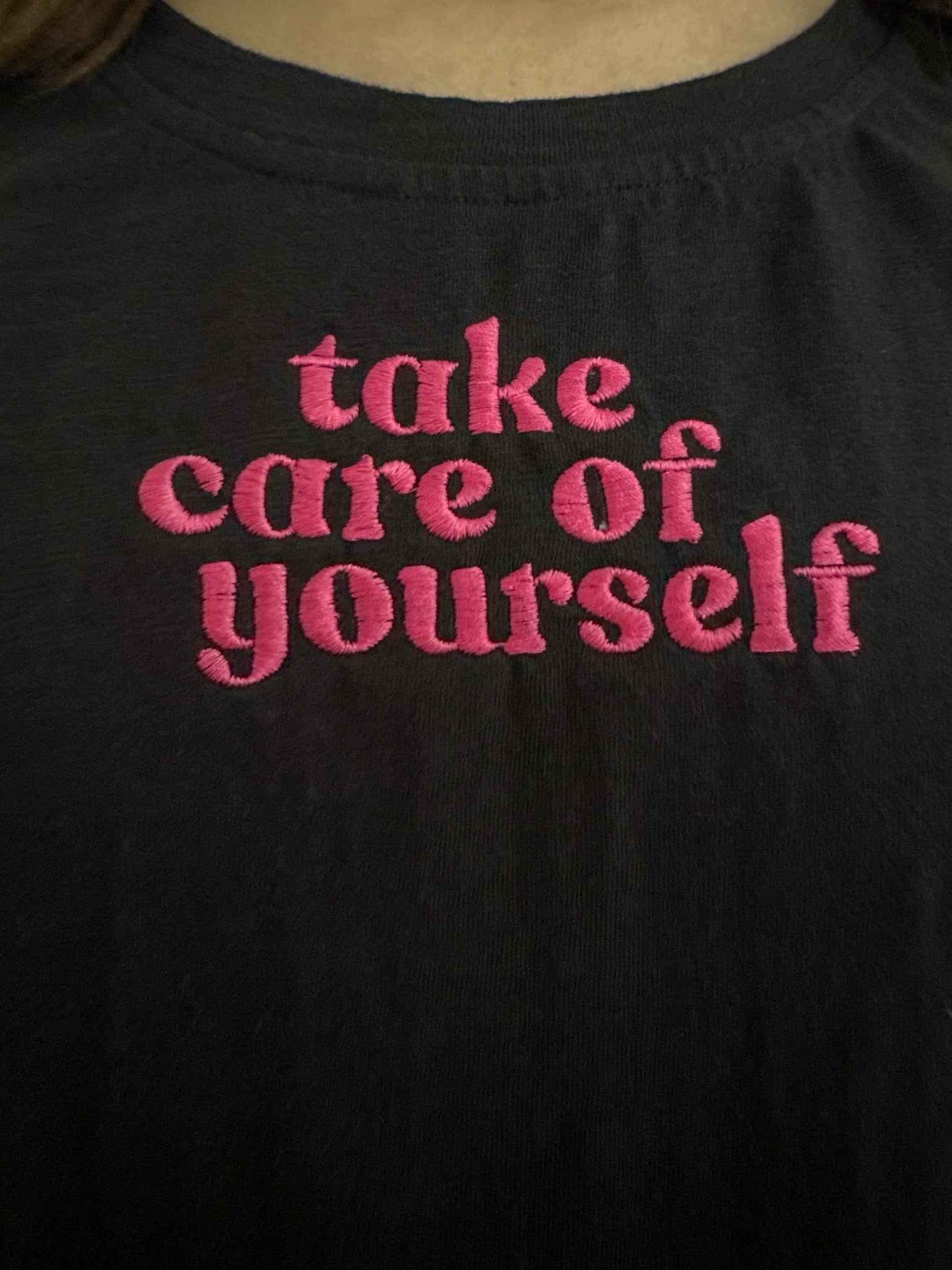 Support small businesses and the planet with Take Care of Yourself, an embroidered sustainable secondhand garment. Upcycled and made with slow fashion principles, this unique piece not only benefits you but also the environment. Embrace an eco-friendly lifestyle and stand out from the crowd!