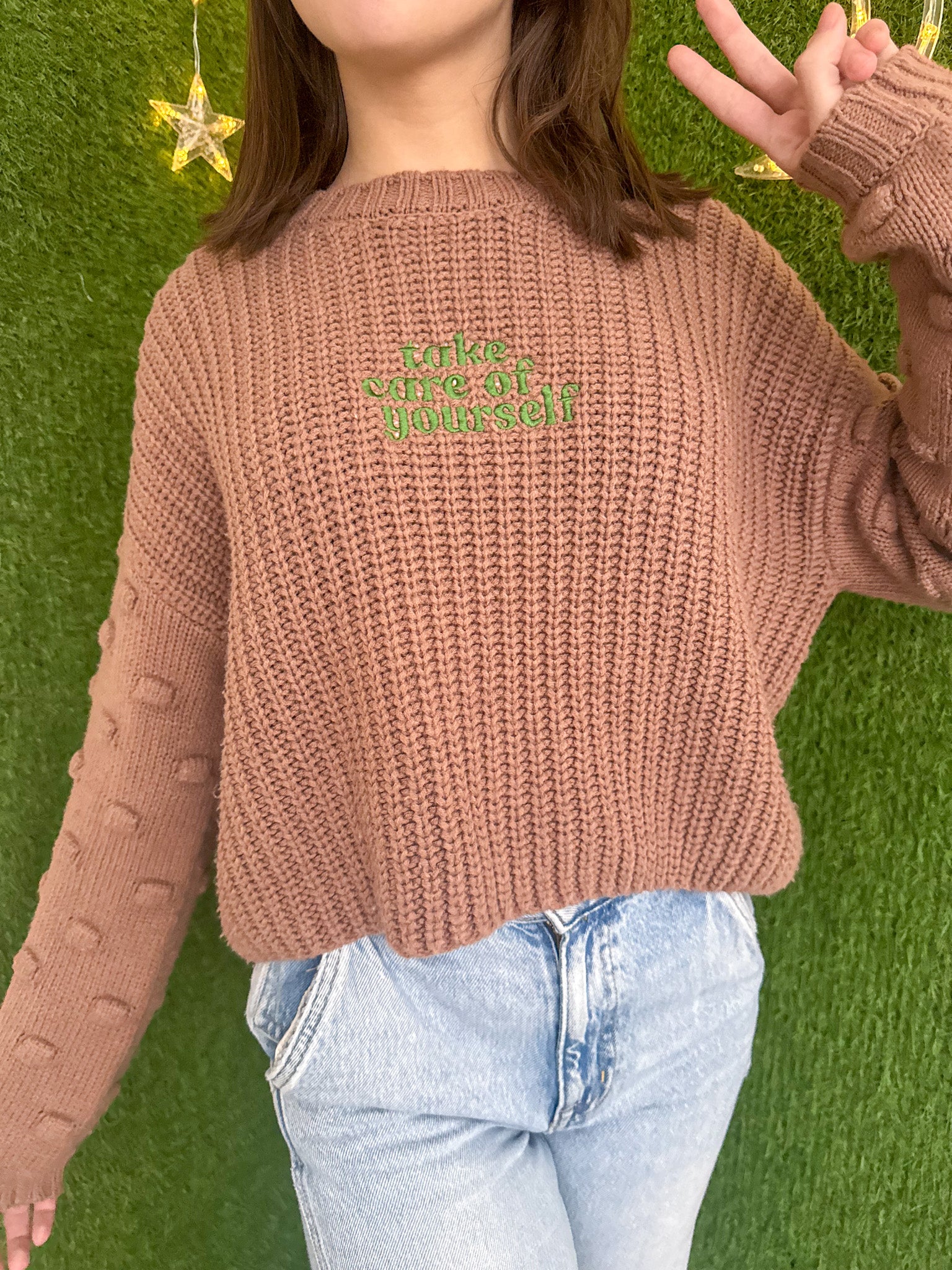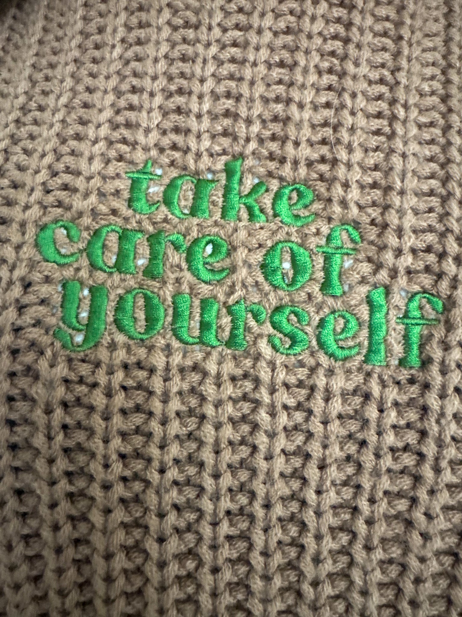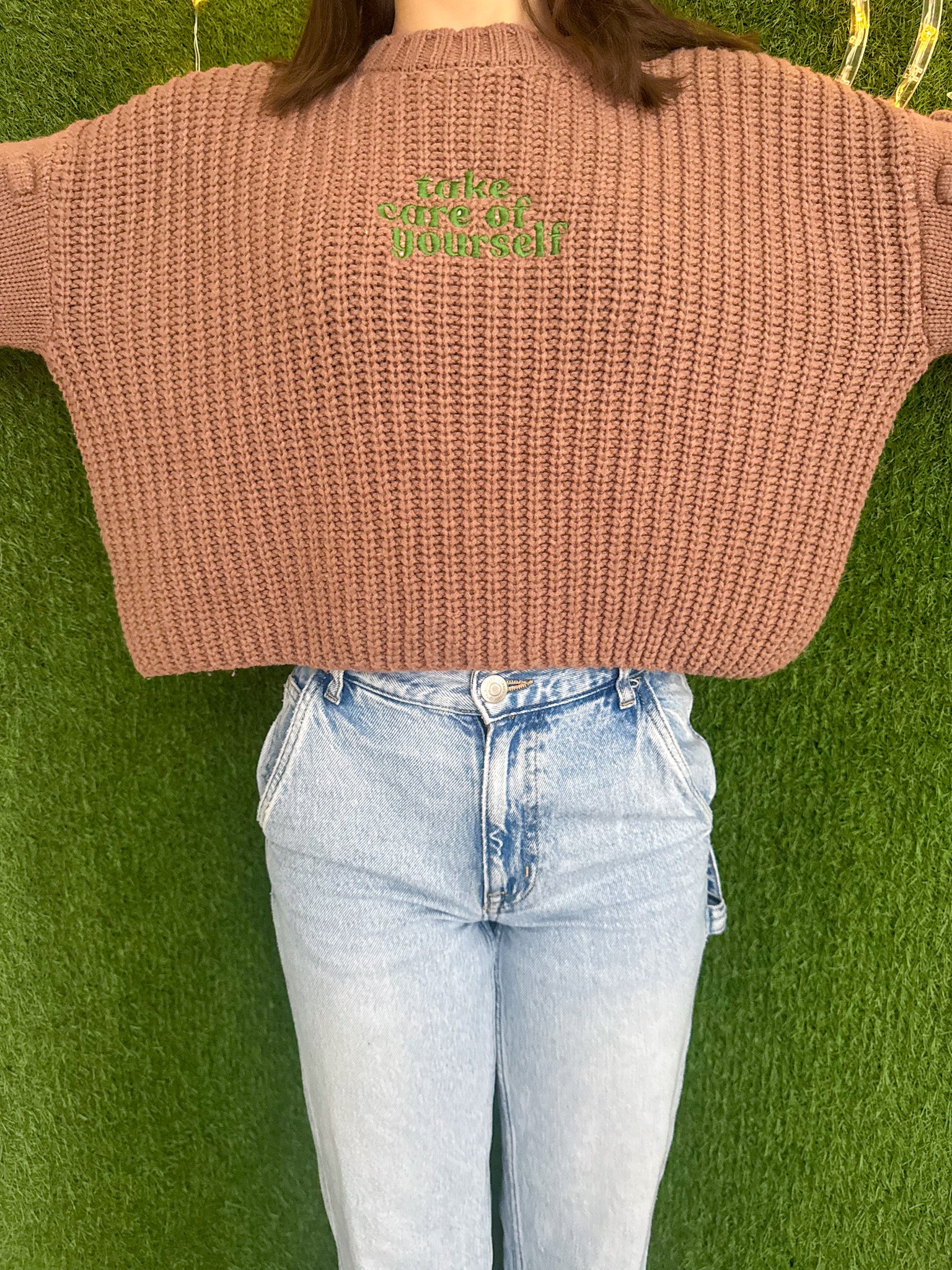 Experience sustainable, slow fashion with our Take Care of Yourself Brown Sweater. Made from upcycled, secondhand garments, each piece is unique and eco-friendly. Featuring delicate embroidered details, support our small biz while taking care of yourself and the planet!!!