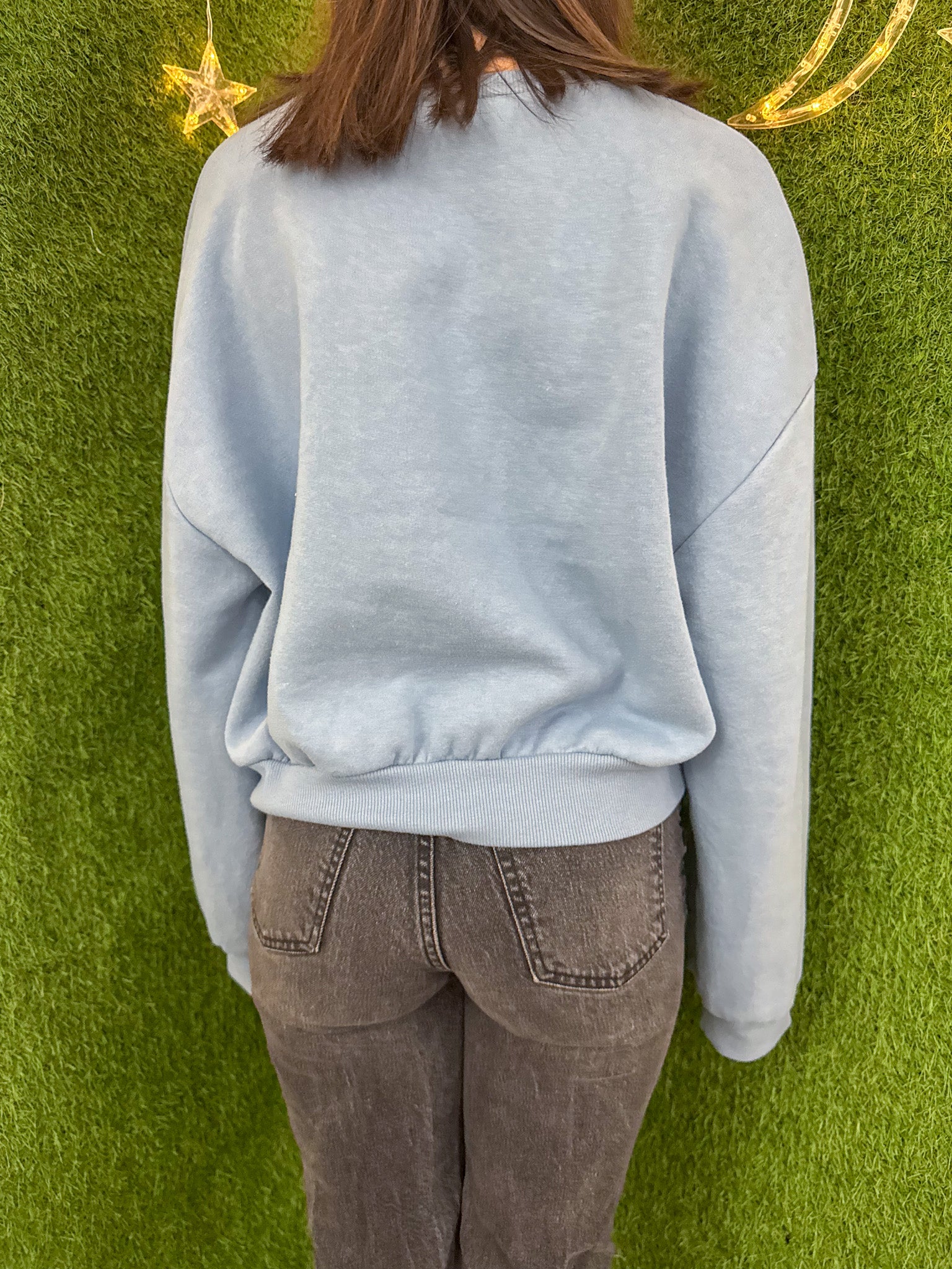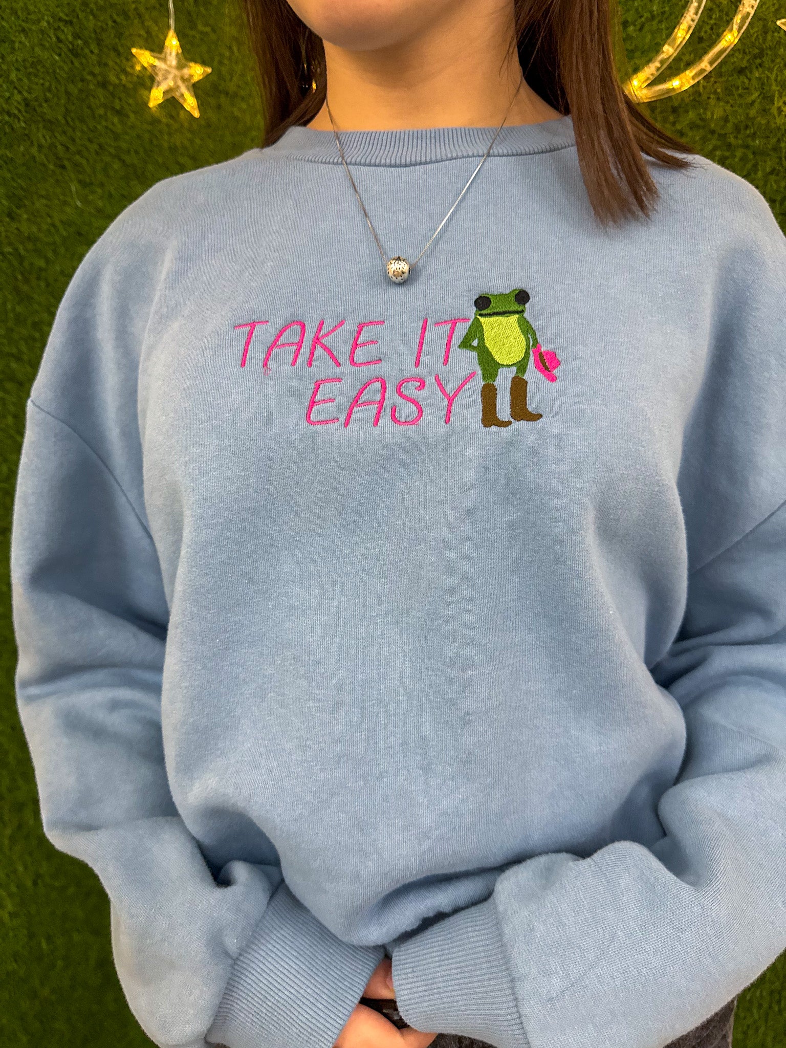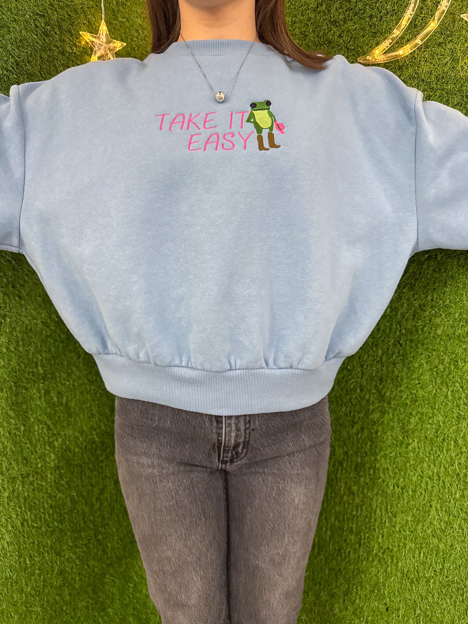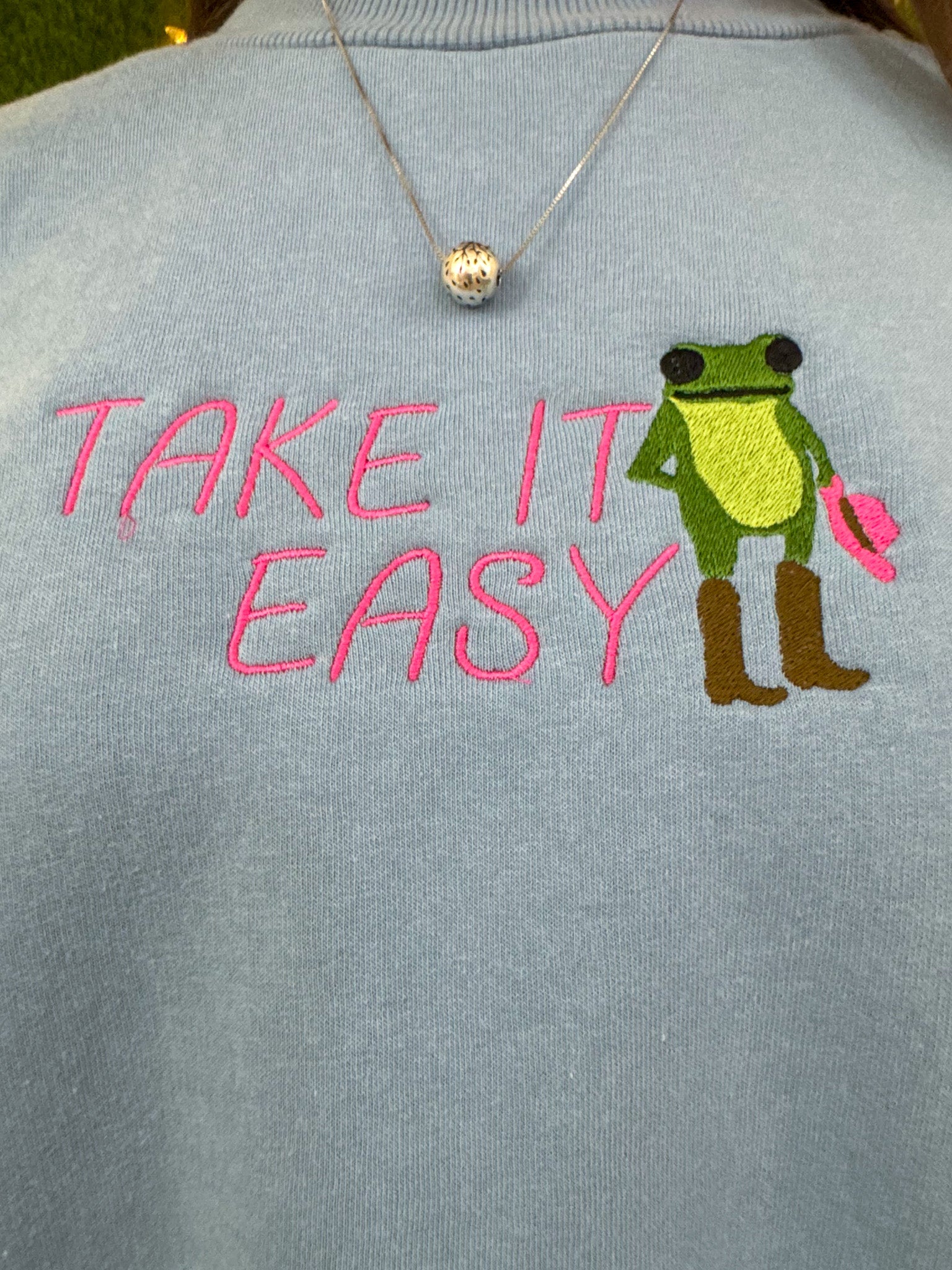 Support our small biz with this sustainably made Take it Easy Blue Crewneck. Made with upcycled materials, each embroidered piece is unique and part of the slow fashion movement. Look good while doing good!!<3