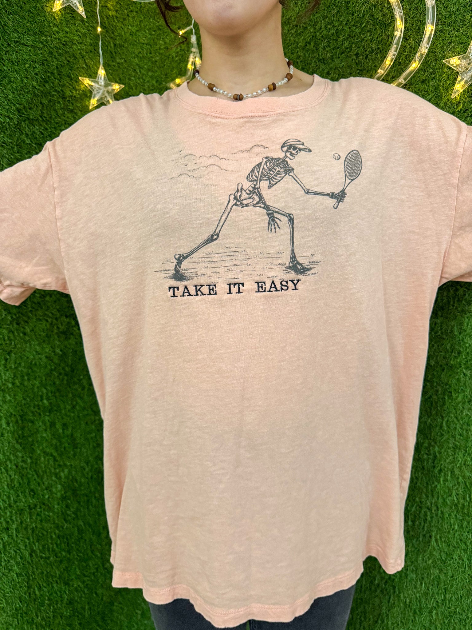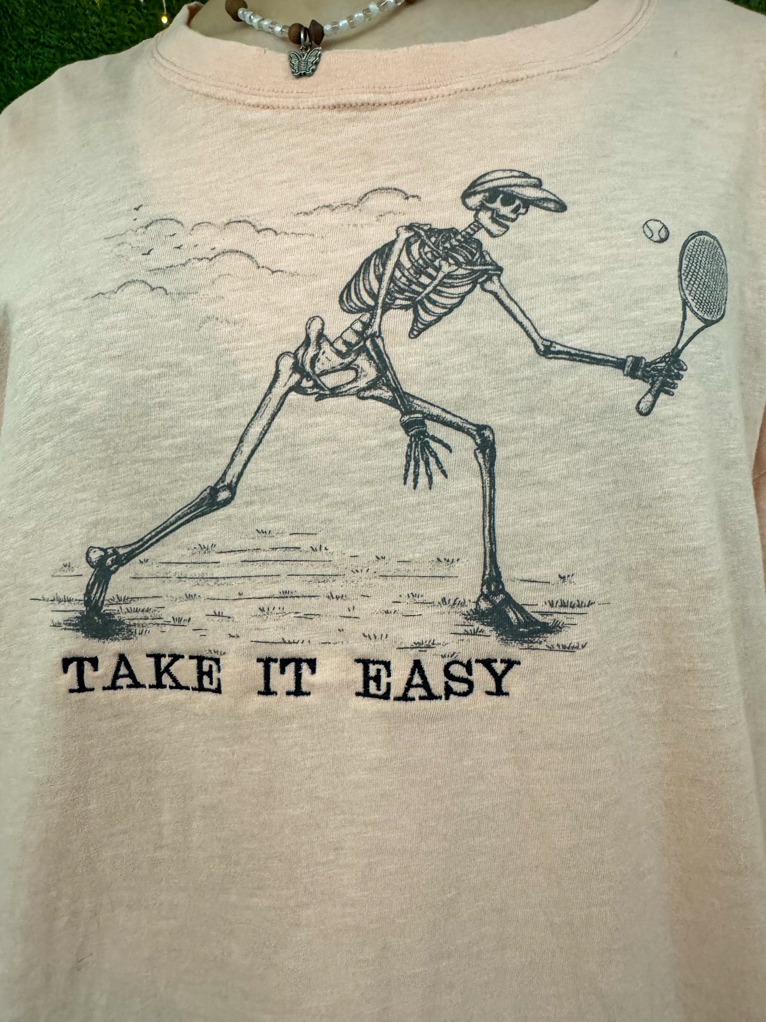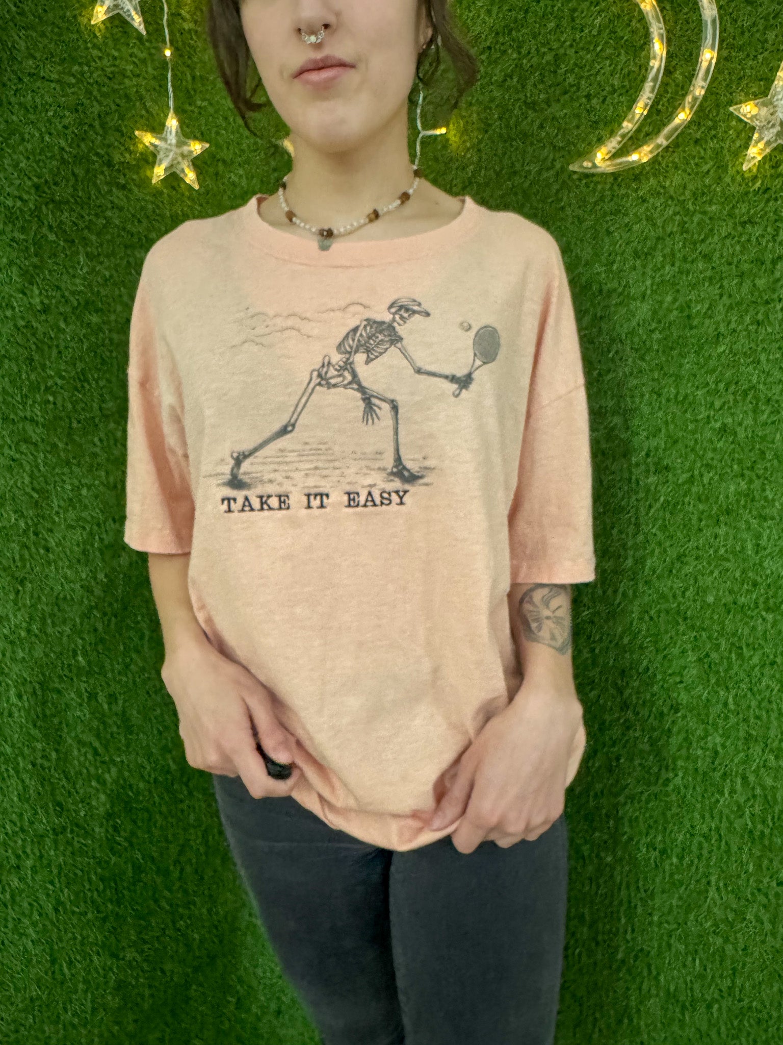 Get ready to serve up some style with our Take It Easy Tennis Skeleton T-Shirt! This unique shirt features an embroidered design and upcycled from a secondhand garment, making it a great option for slow fashion lovers. Plus, with every purchase, you support our small business. Serve up some good vibes and add this shirt to your collection today!