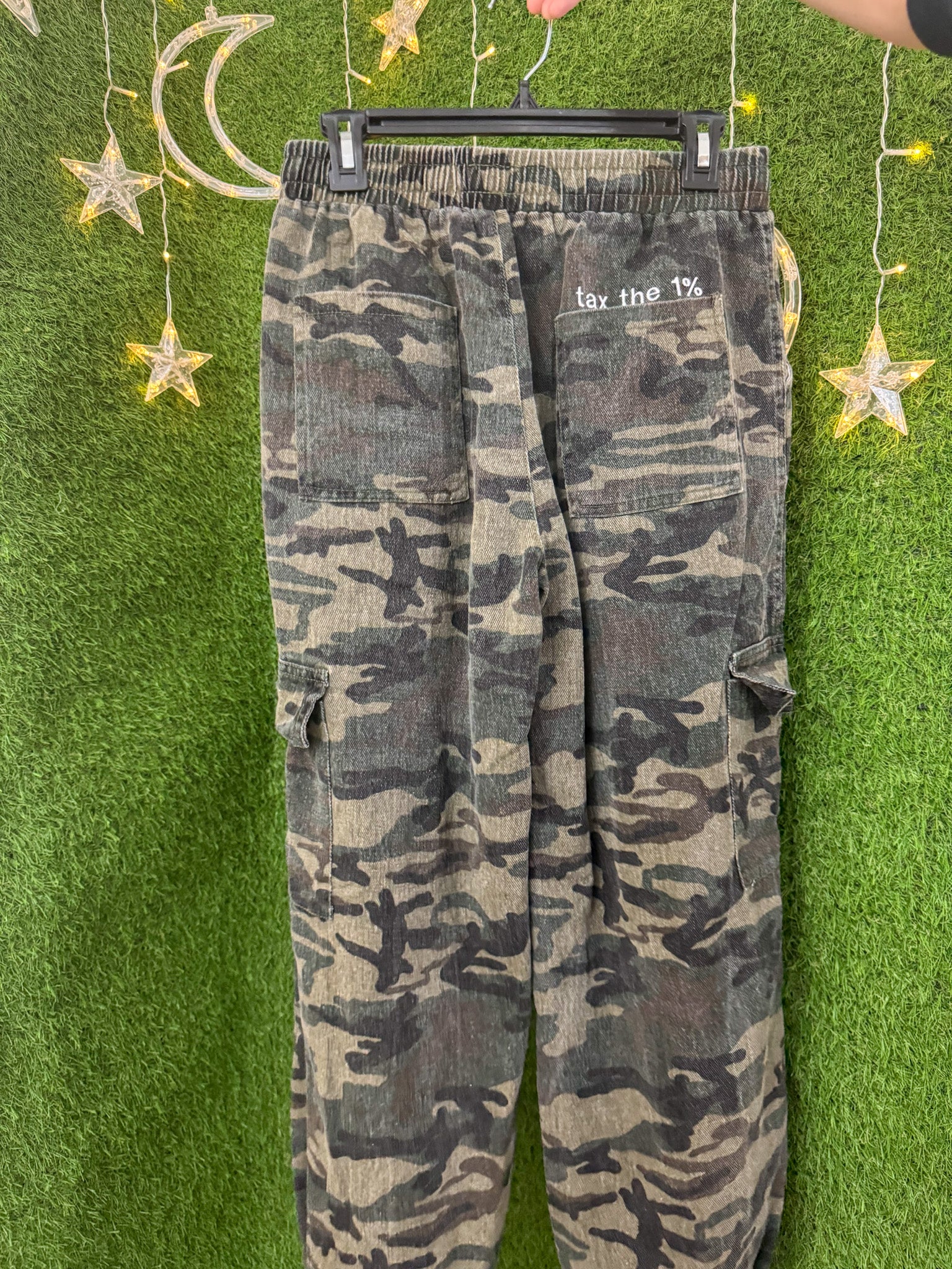 These Tax The 1% Camo Jogger Pants are upcycled from a secondhand garment, embodying sustainable slow fashion. Featuring unique embroidered details, it supports our small business while reducing waste. Comfortable and eco-conscious, they make a statement for both style and the planet!