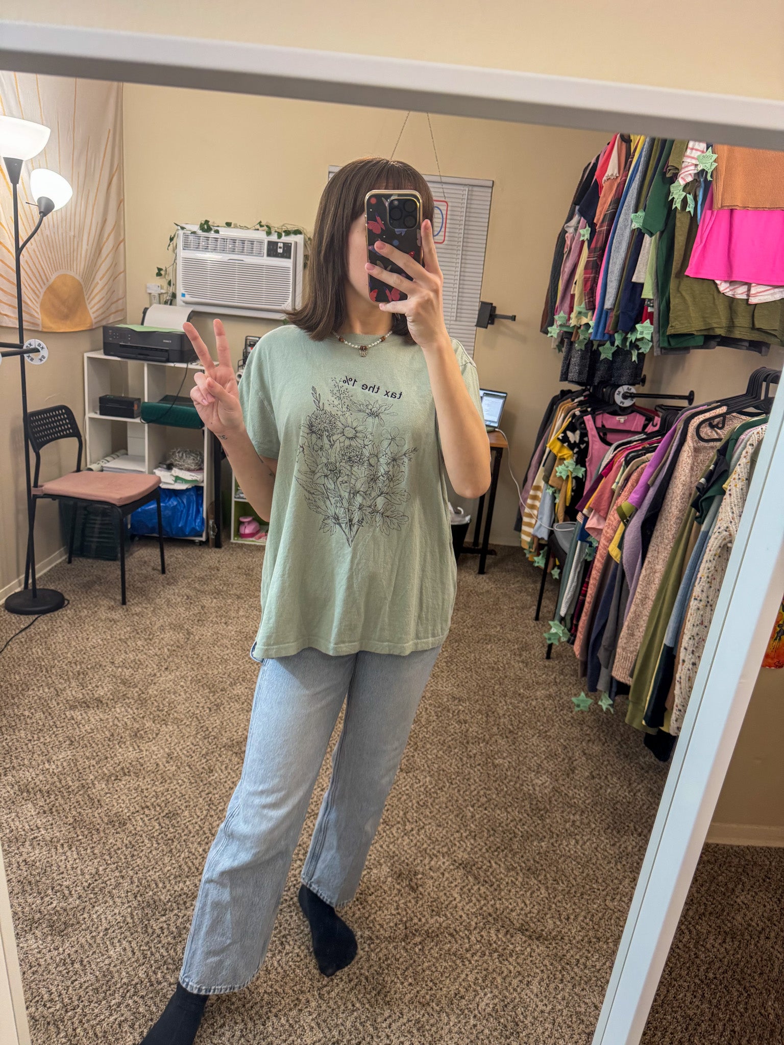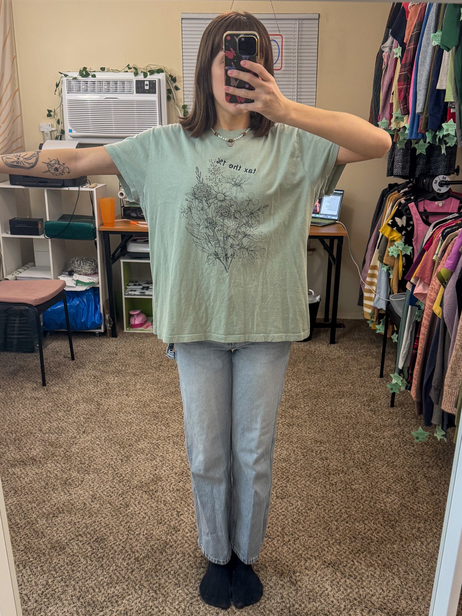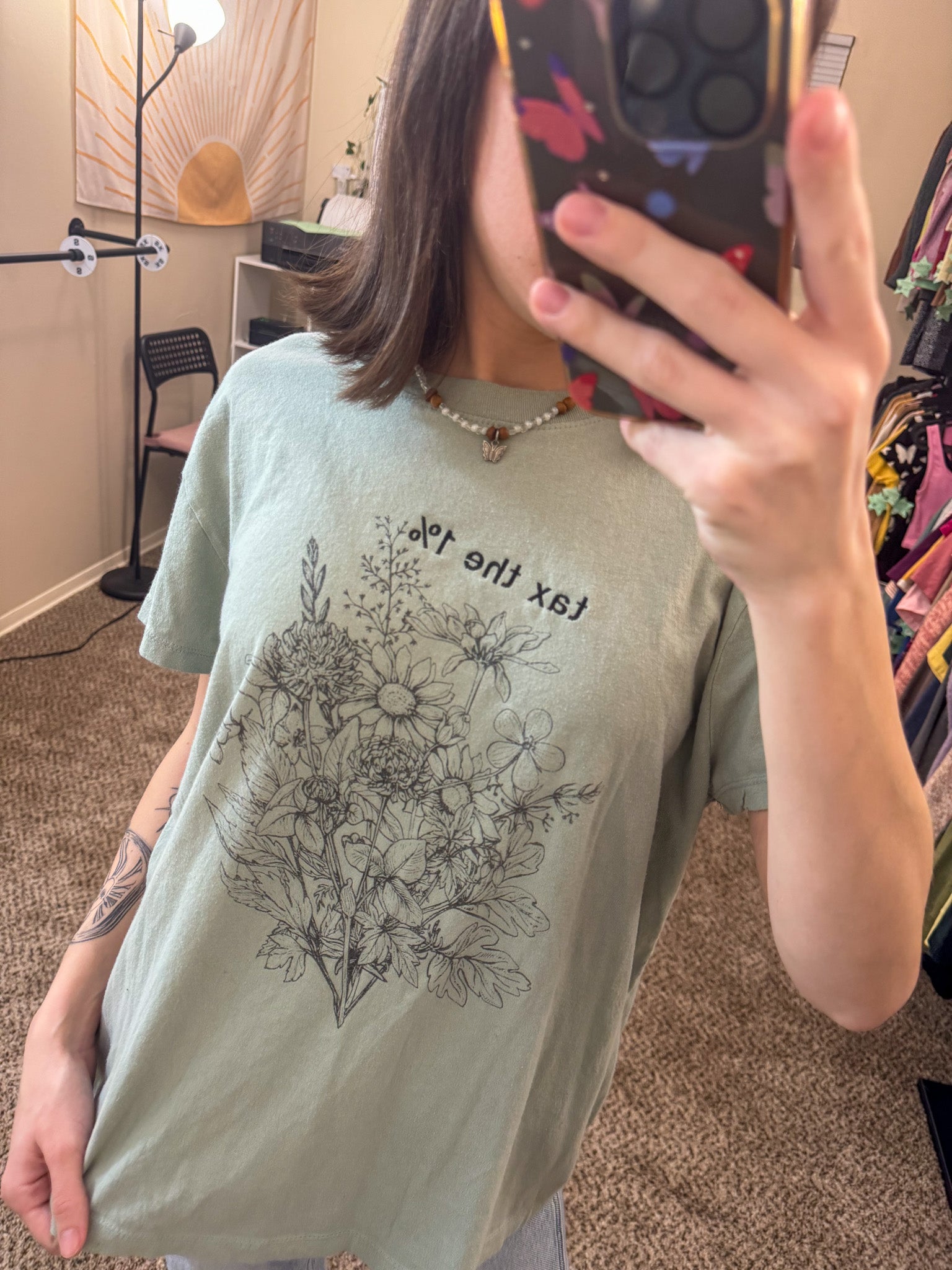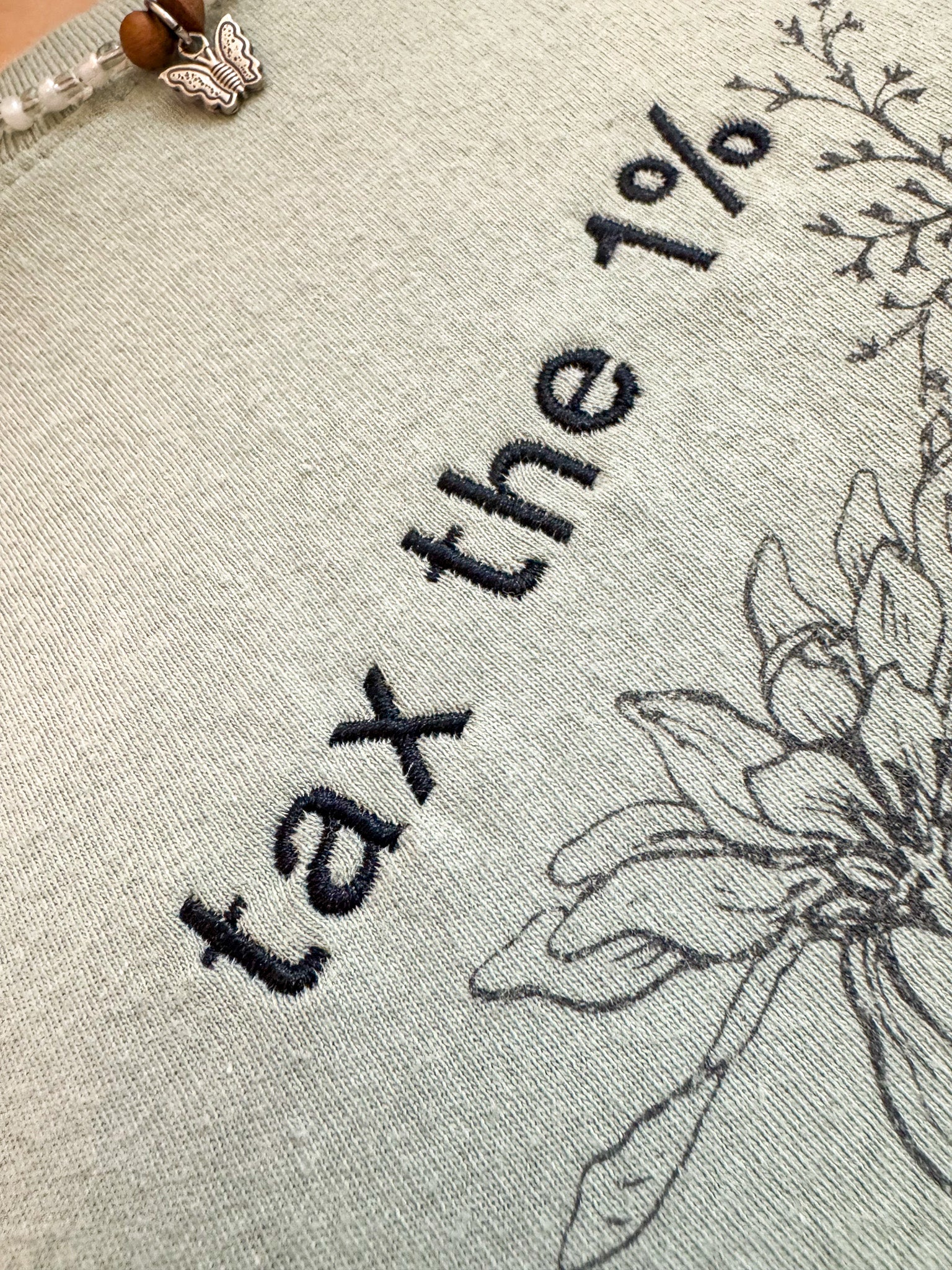 Join the revolution in style with the Tax the 1% Floral T-Shirt! Each garment is embroidered by us to support our small biz, making it a sustainable and upcycled choice. This discarded secondhand garment is a statement for slow fashion. Don't just wear a shirt, wear a movement!
