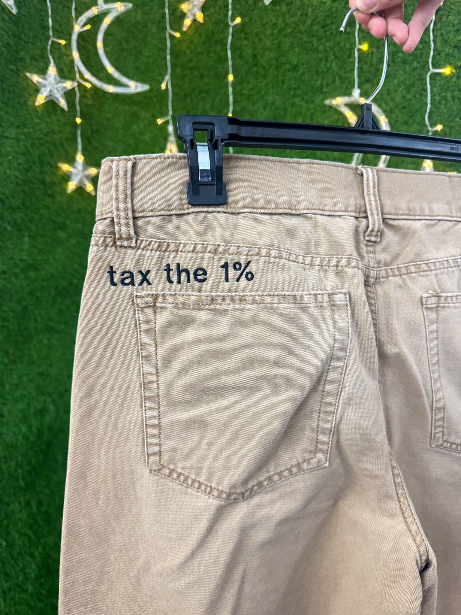 These Tax The 1% Khaki Pants are upcycled from a secondhand garment and feature delicate embroidery. Embrace sustainable, slow fashion while supporting our small business with this eco-friendly, unique piece!