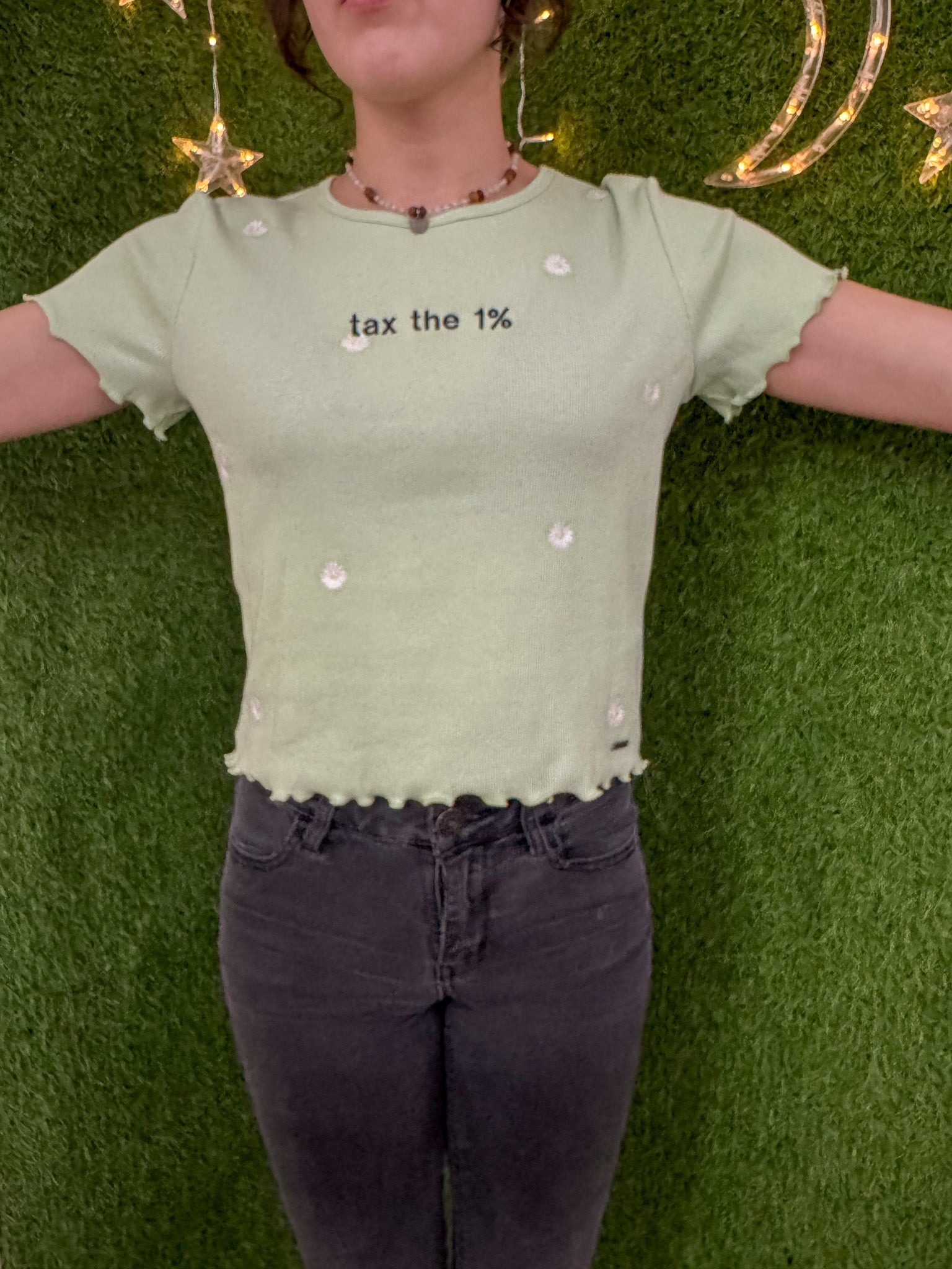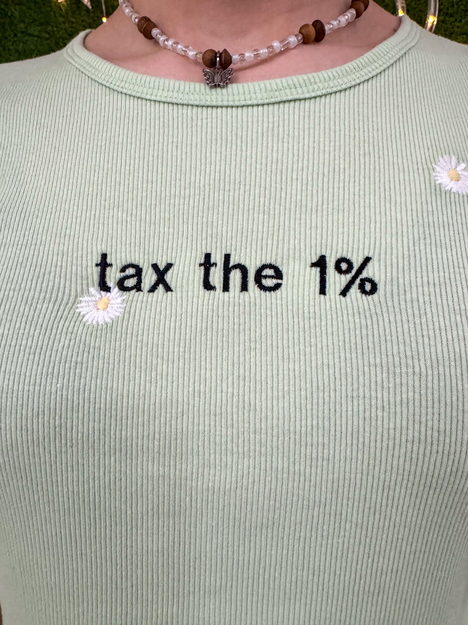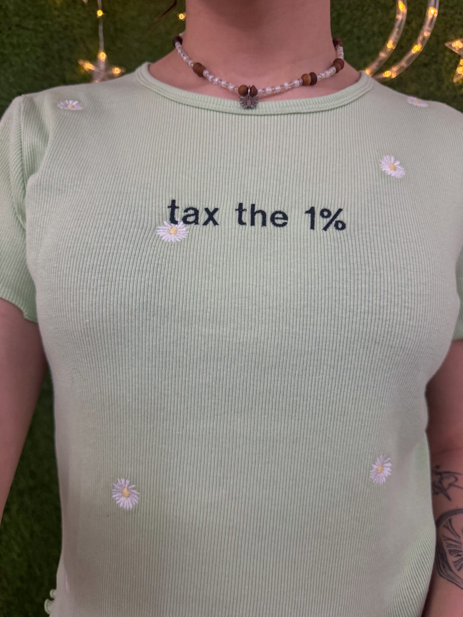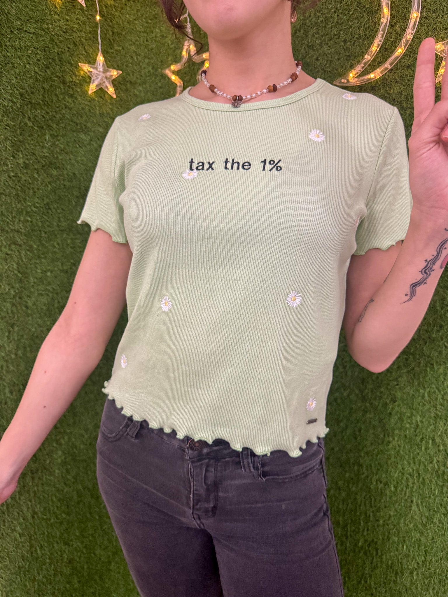 Spread some positivity with our Tax the 1% Pastel Flower Scalloped Edge Tee! This embroidered, upcycled, secondhand garment not only supports our small biz, but also promotes sustainability and slow fashion. Be a trendsetter while making a difference!