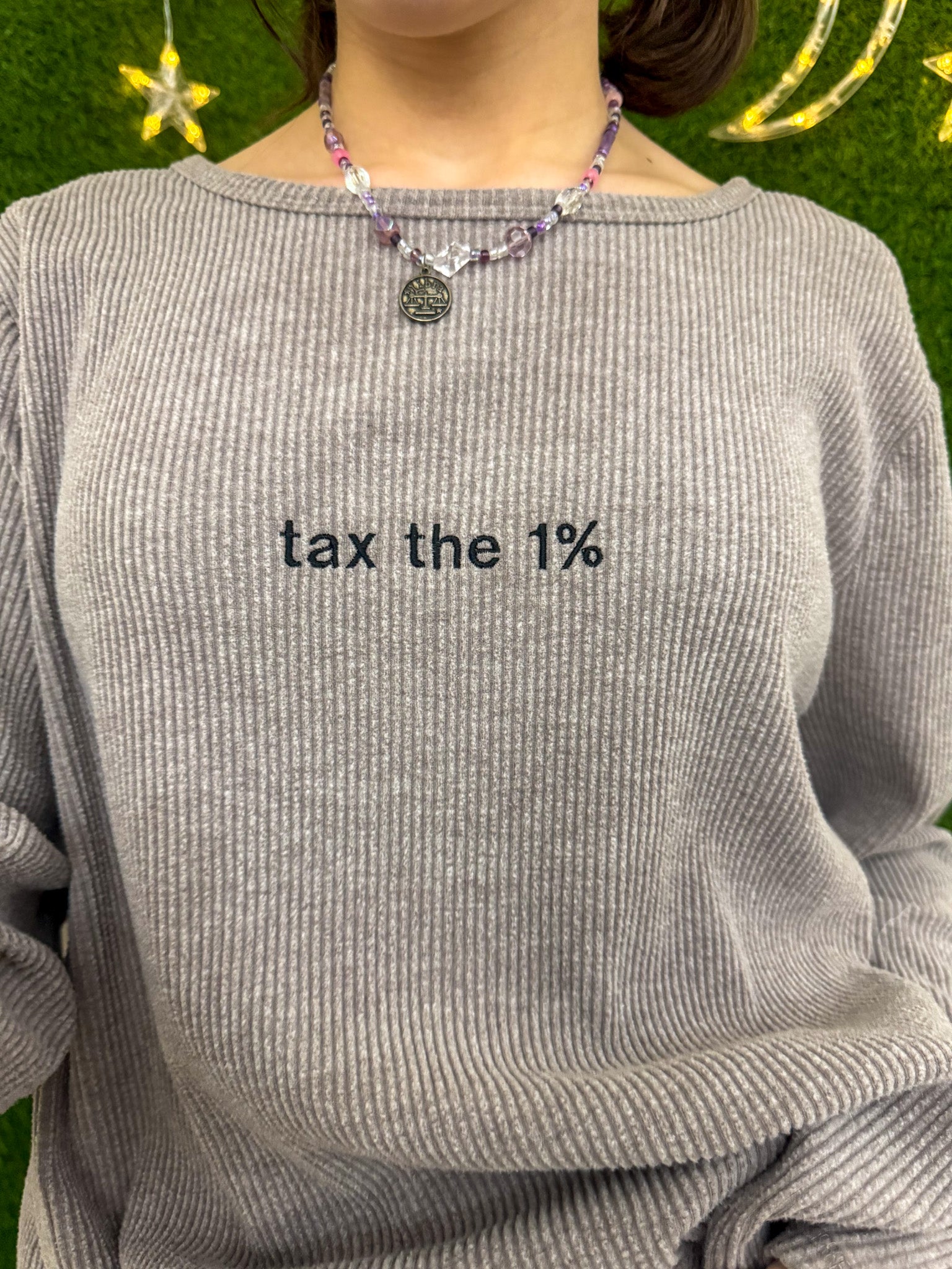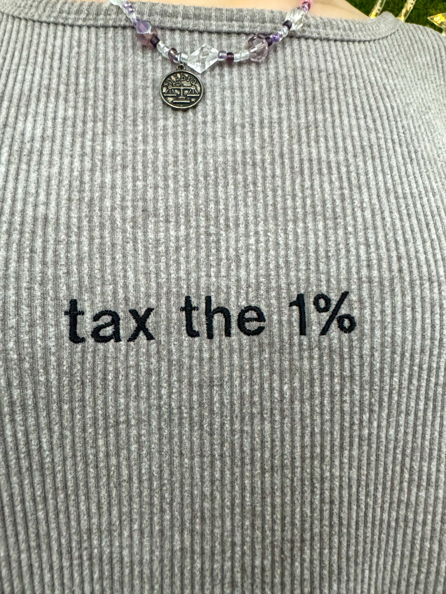 Show your support for small businesses with our Tax the 1% Ribbed Long Sleeve. This eco-friendly top is upcycled from a secondhand garment, making it a sustainable and slow fashion choice. Featuring an embroidered design, it's the perfect way to make a statement while being environmentally conscious!!