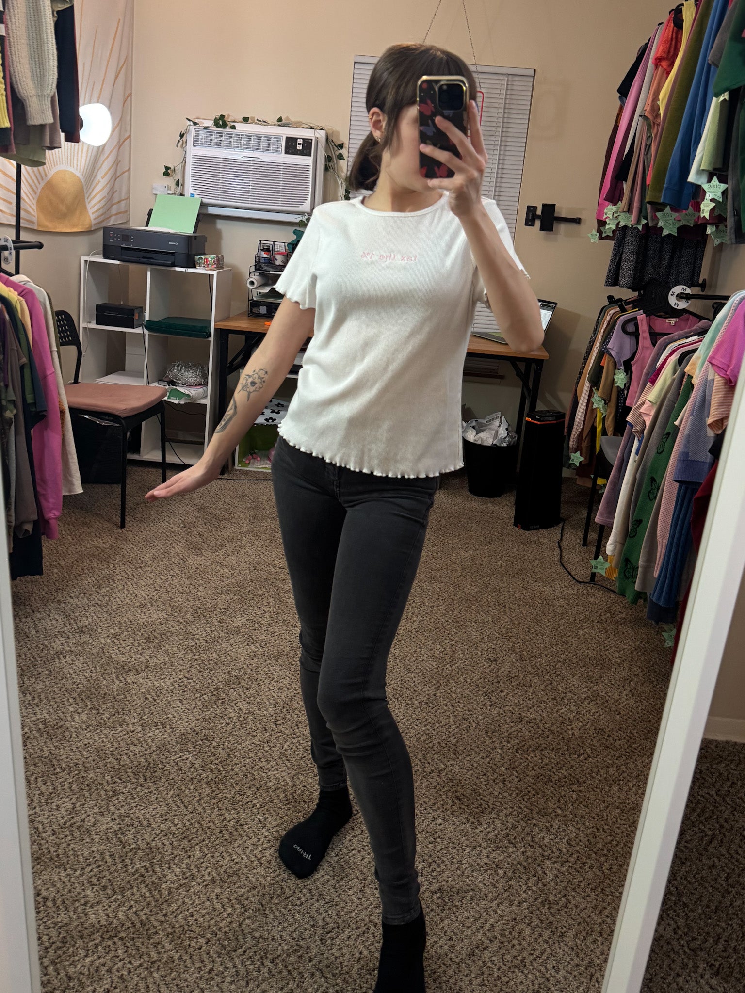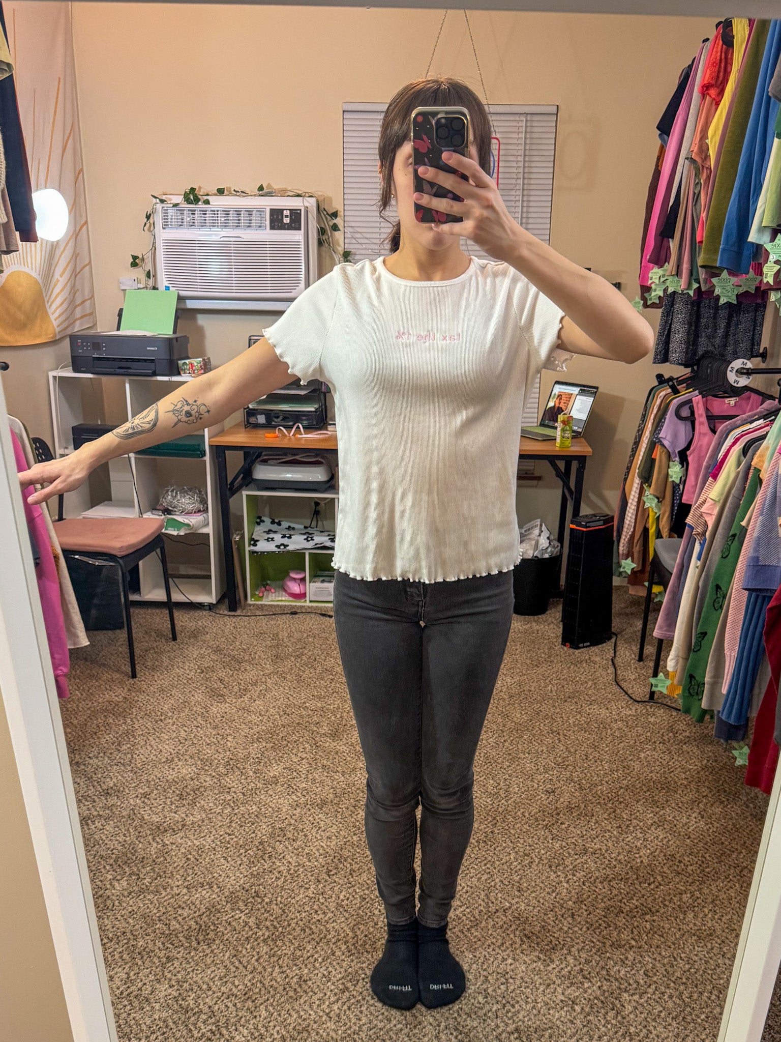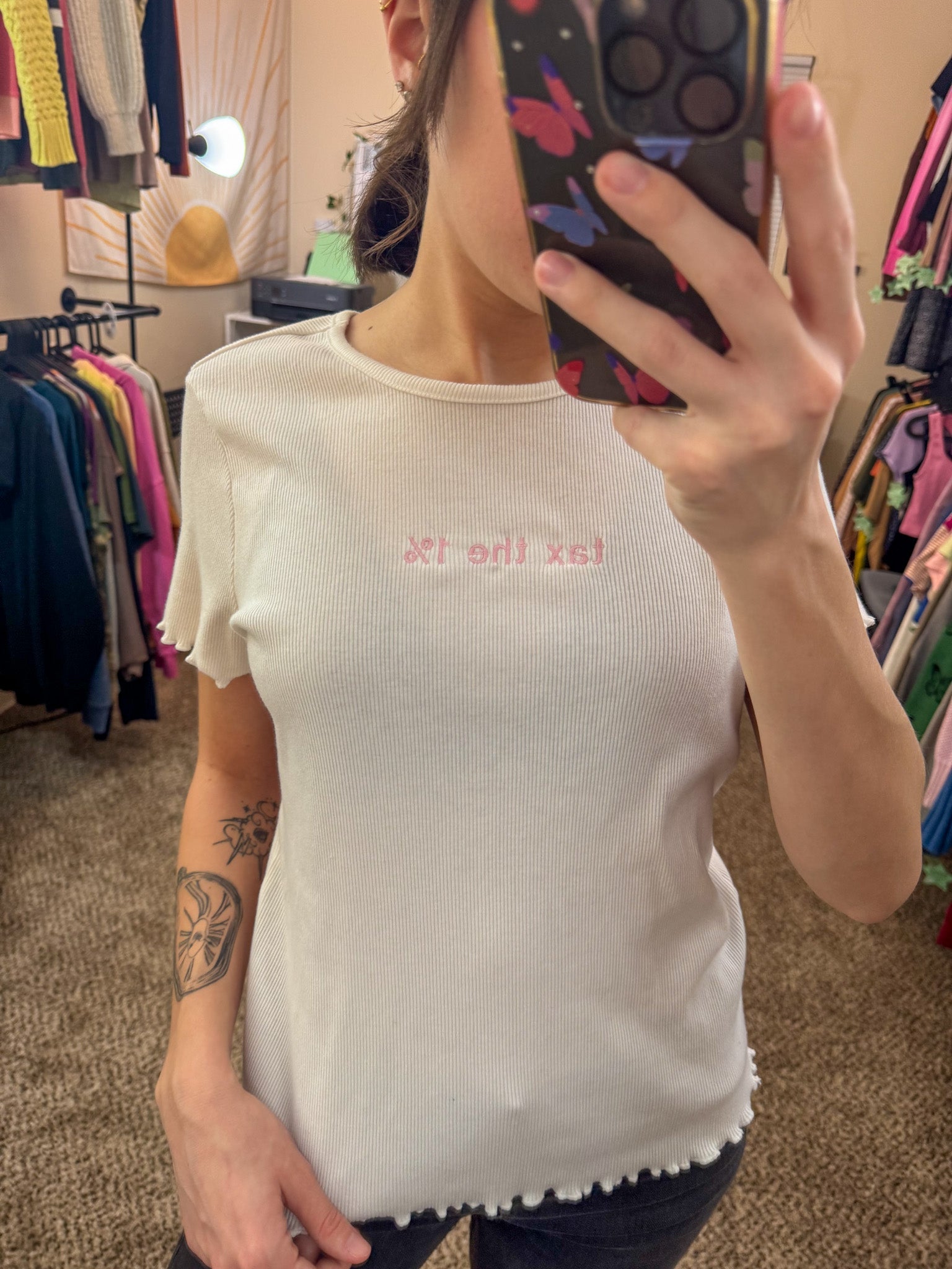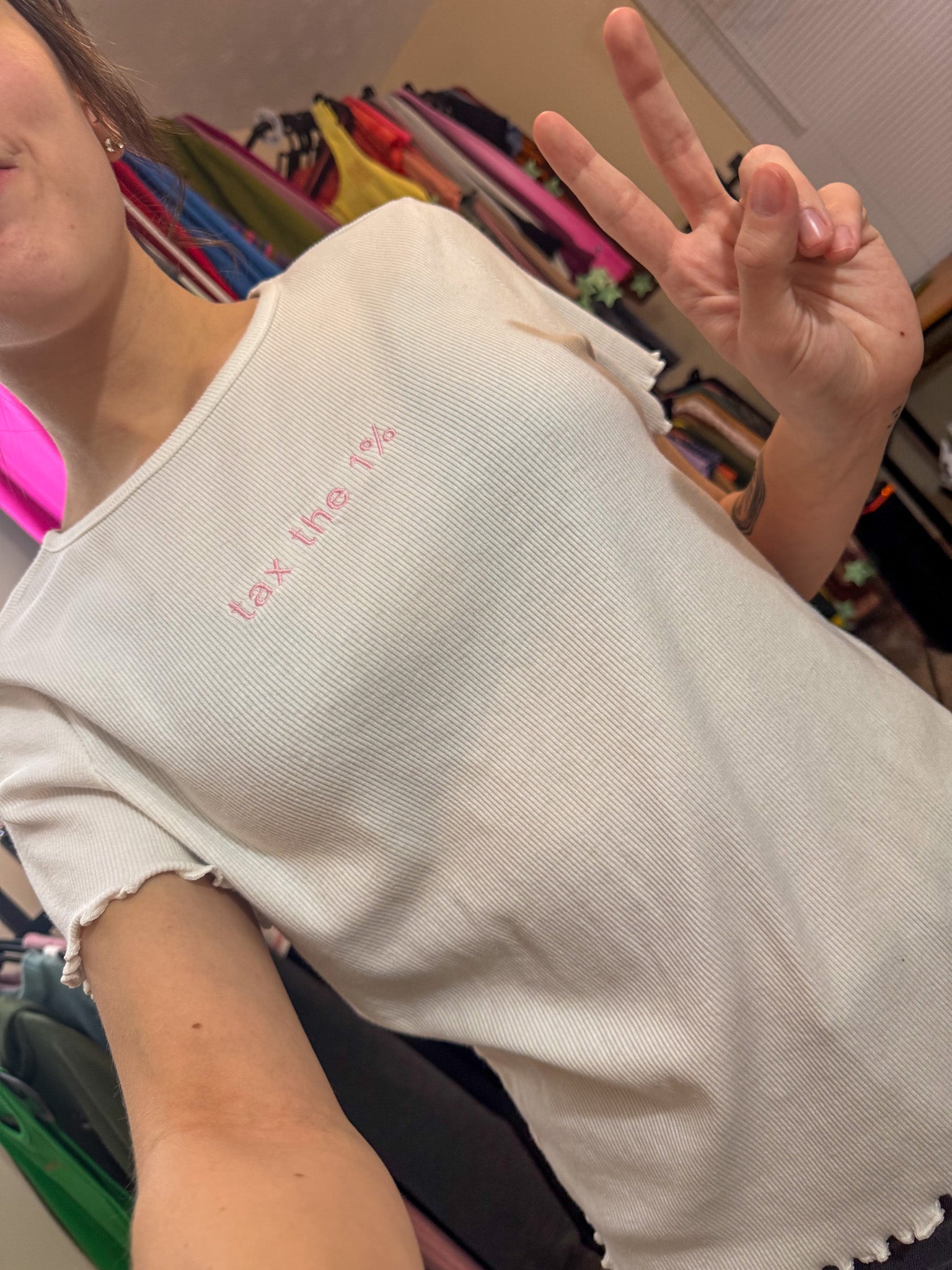 Get ready to make a statement with our Tax the 1% Ribbed T-Shirt. This top is uniquely embroidered by us, showing off our playful personality! By supporting our small biz, you're also helping the environment with our sustainable, upcycled, and discarded secondhand garment. Slow fashion never looked this good!