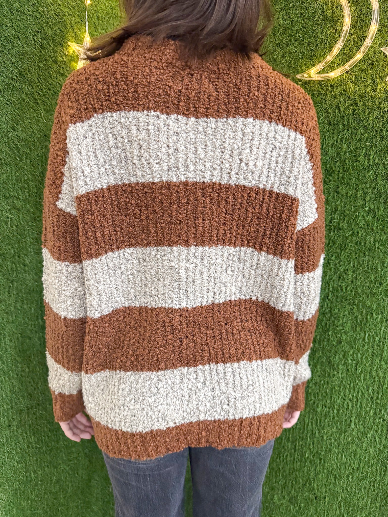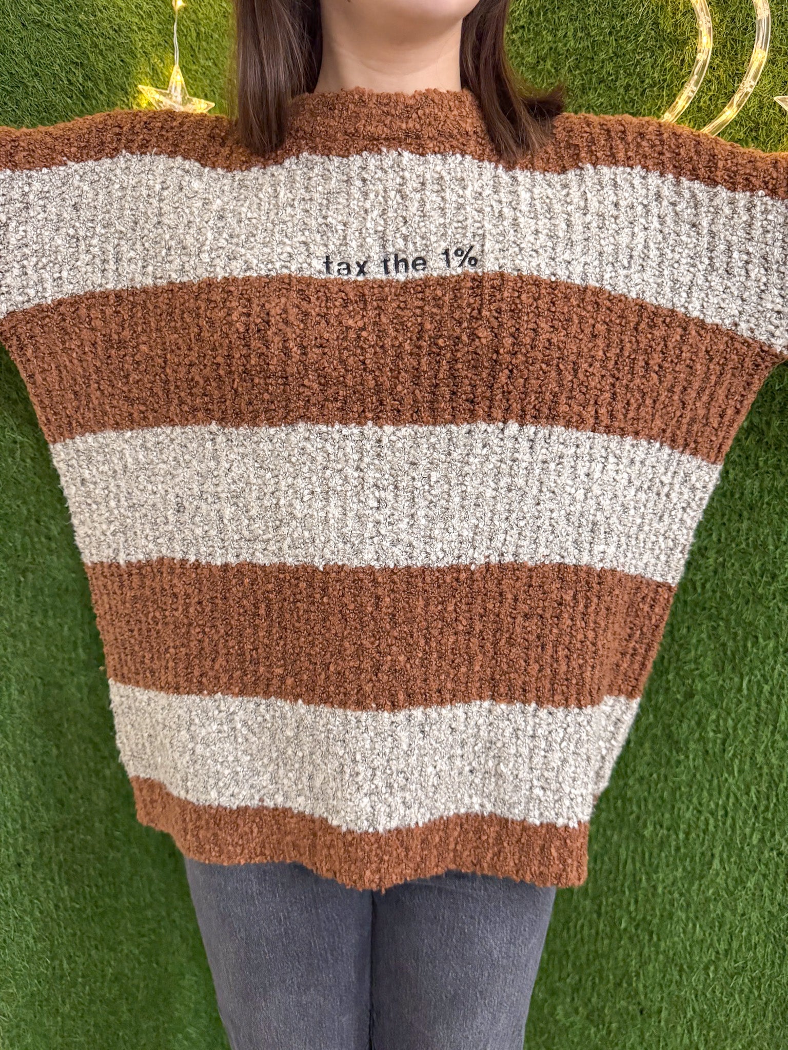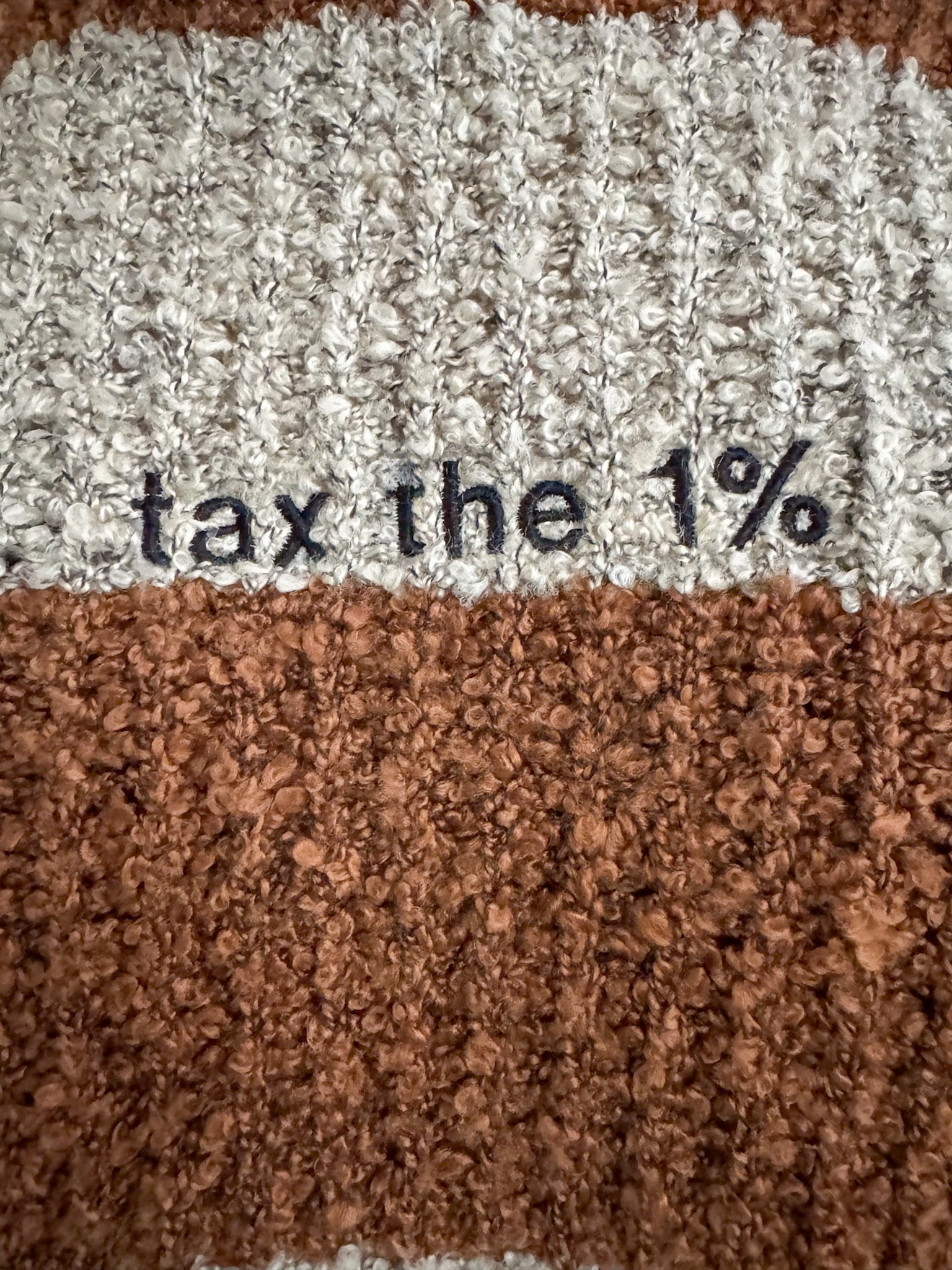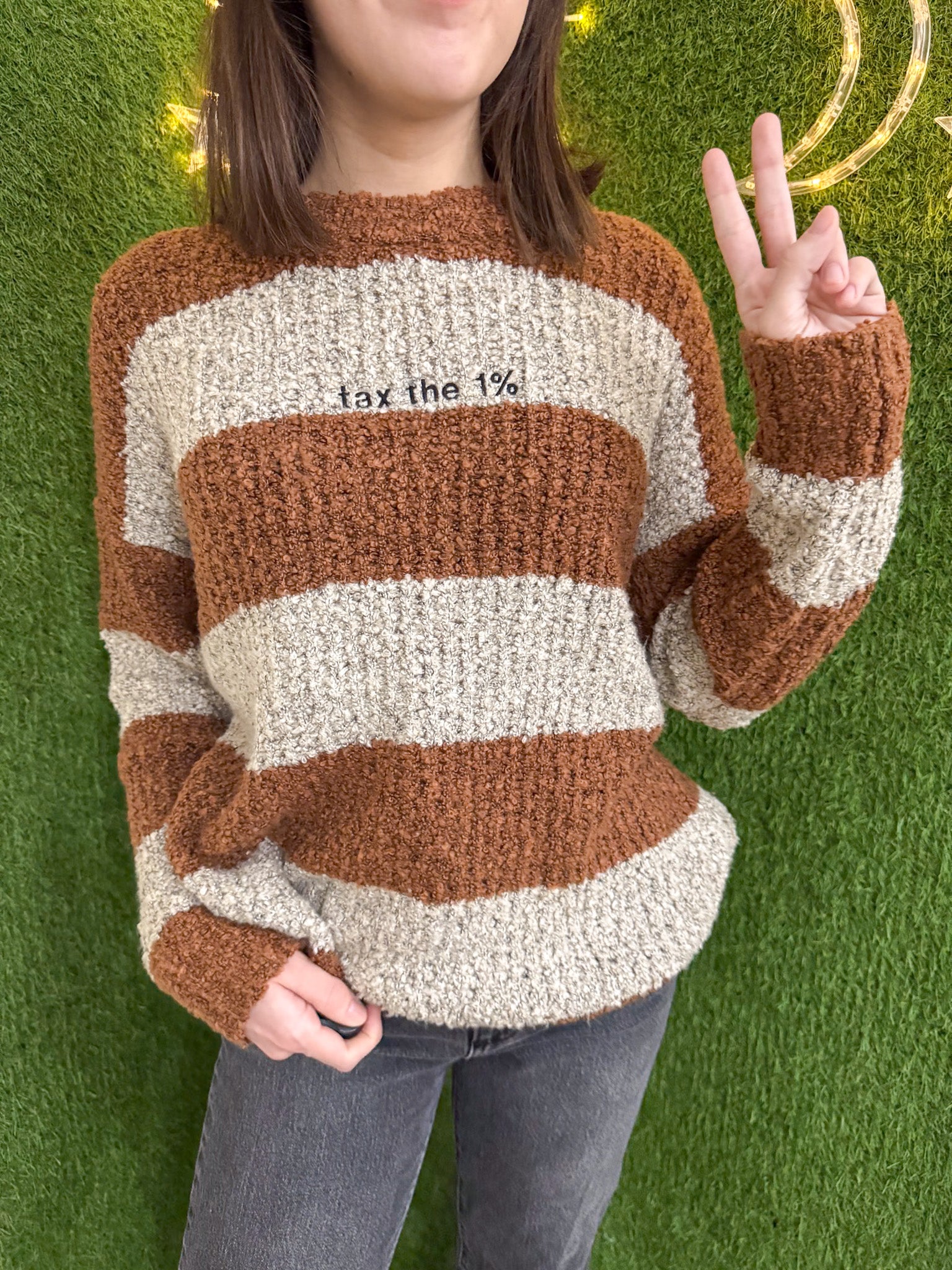 Embrace the anti-fast fashion movement with Tax the 1% Sweater. This tan and brown striped sweater not only has a trendy embroidered design, but also promotes sustainability and supports small businesses through upcycling and slow fashion. Join the cause and make a statement with this thrifted garment!