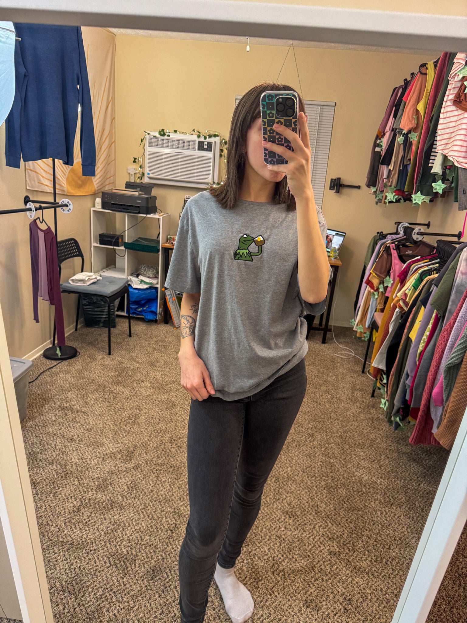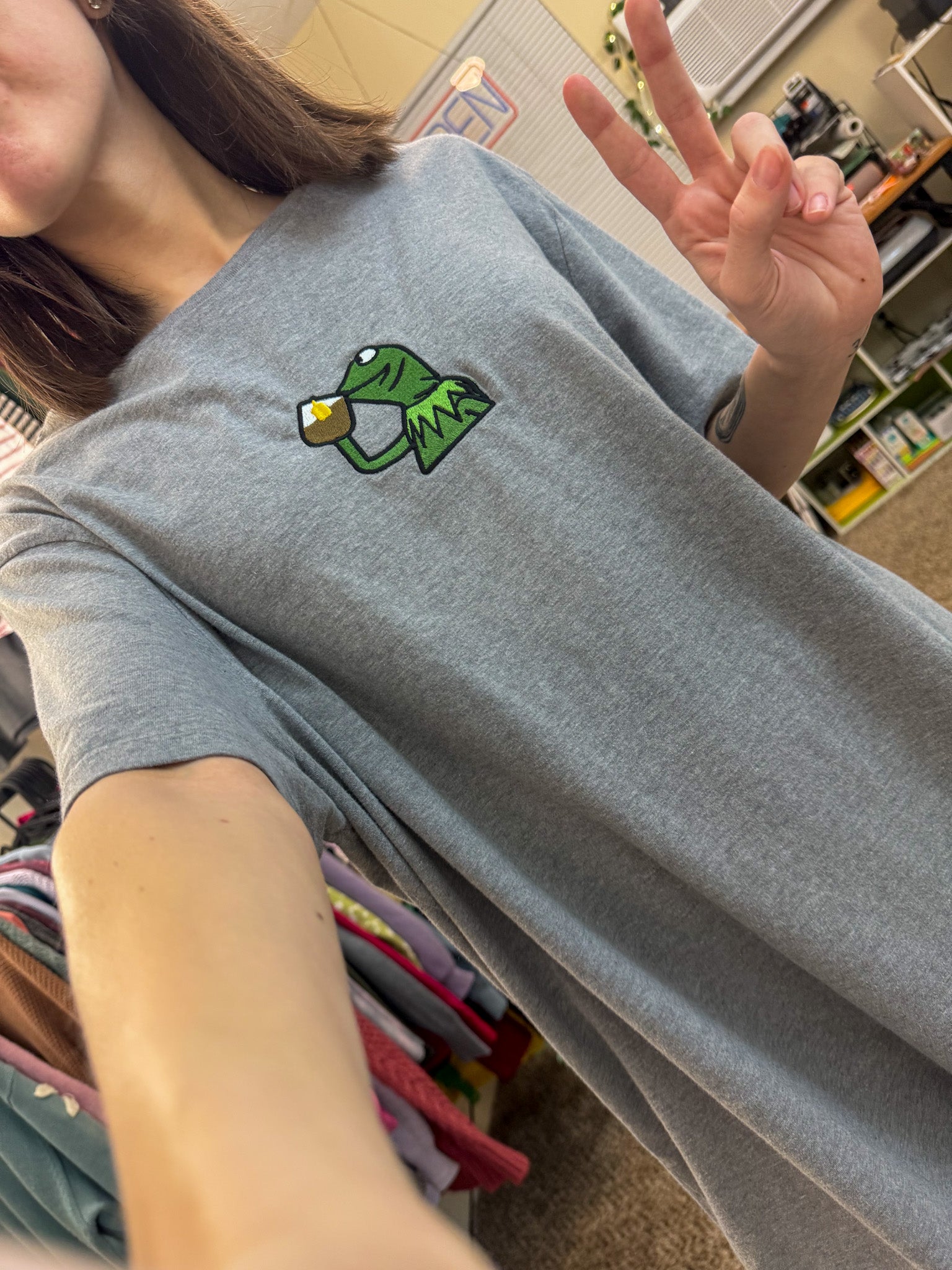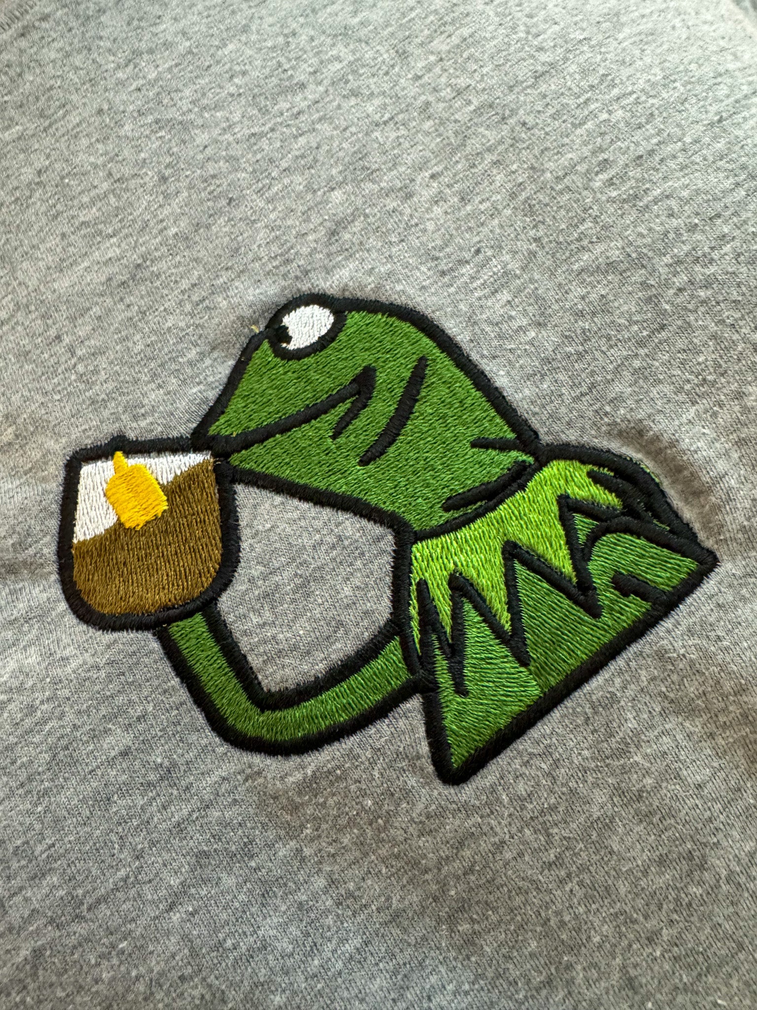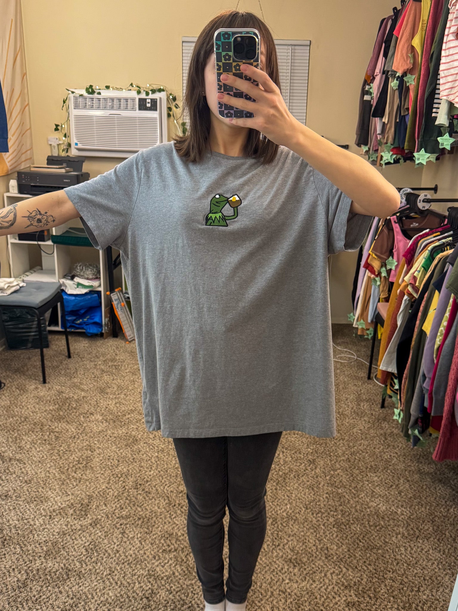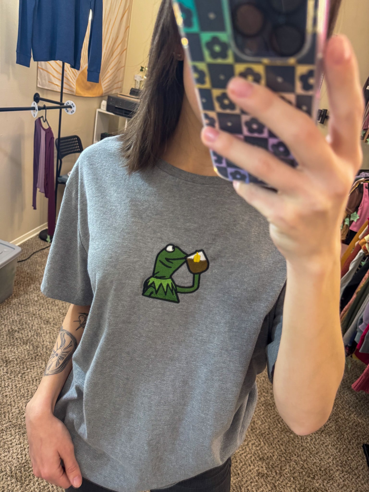 Get cozy and quirky with our Tea Kermit Grey T-Shirt, embroidered by us and upcycled from a discarded secondhand garment. Support our small biz while promoting sustainability and slow fashion. It's a win-win(win)!