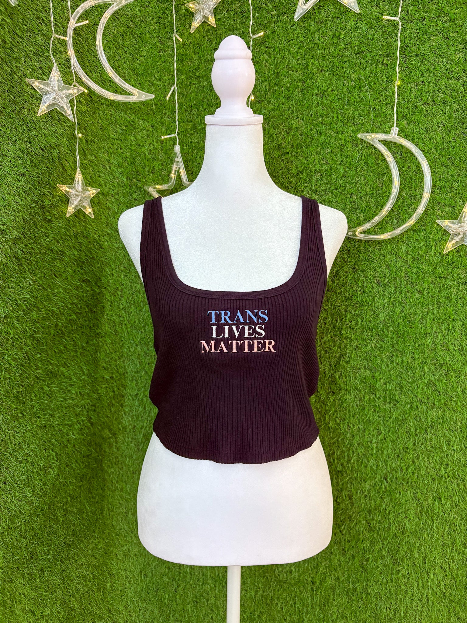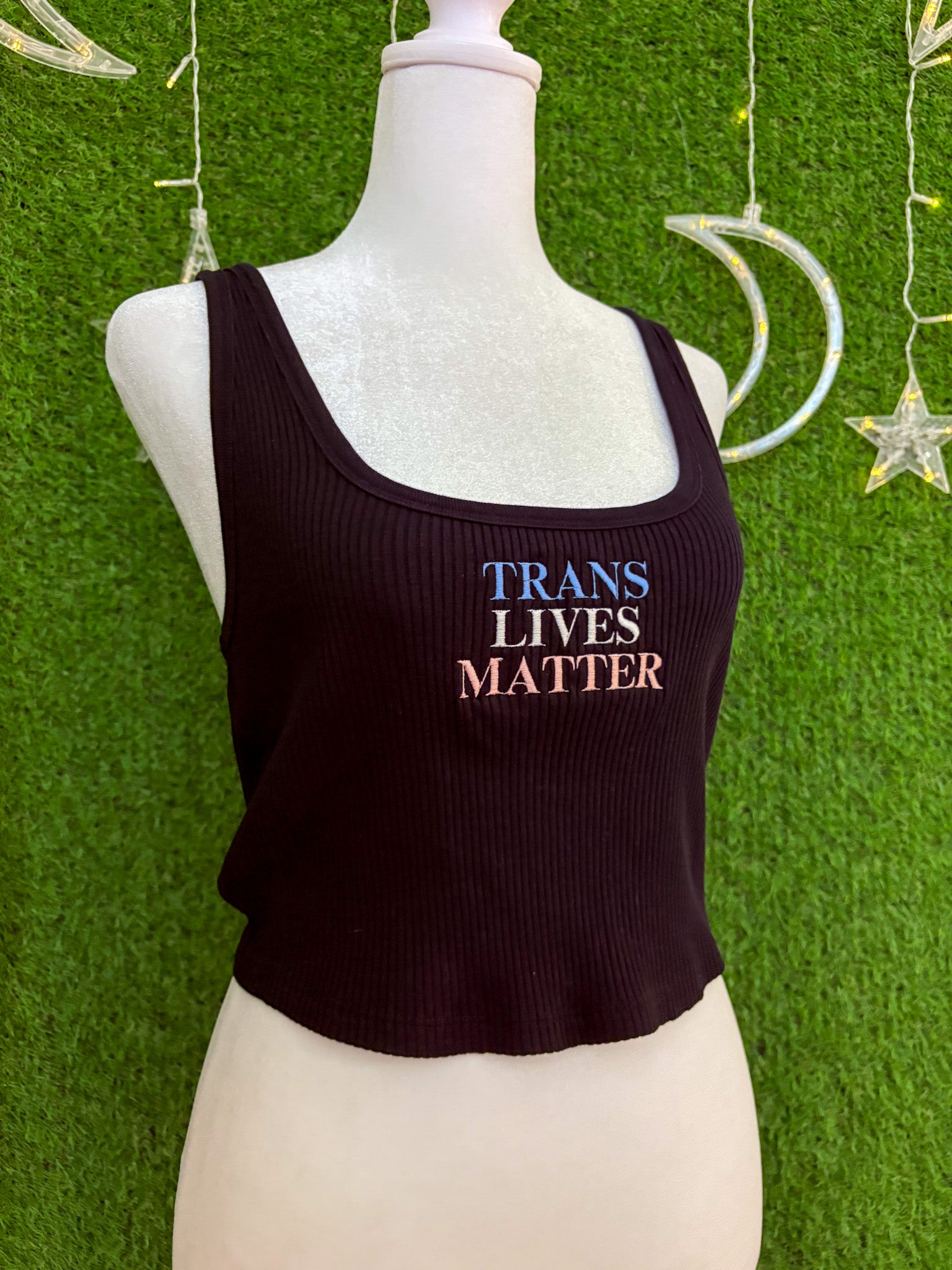 This Trans Lives Matter Ribbed Cropped Tank is thoughtfully upcycled from a secondhand garment, highlighting sustainable and slow fashion values. Featuring intricate embroidery, it offers a stylish way to support eco-friendly choices while reducing waste. Embrace a meaningful wardrobe addition that honors both the planet and community!