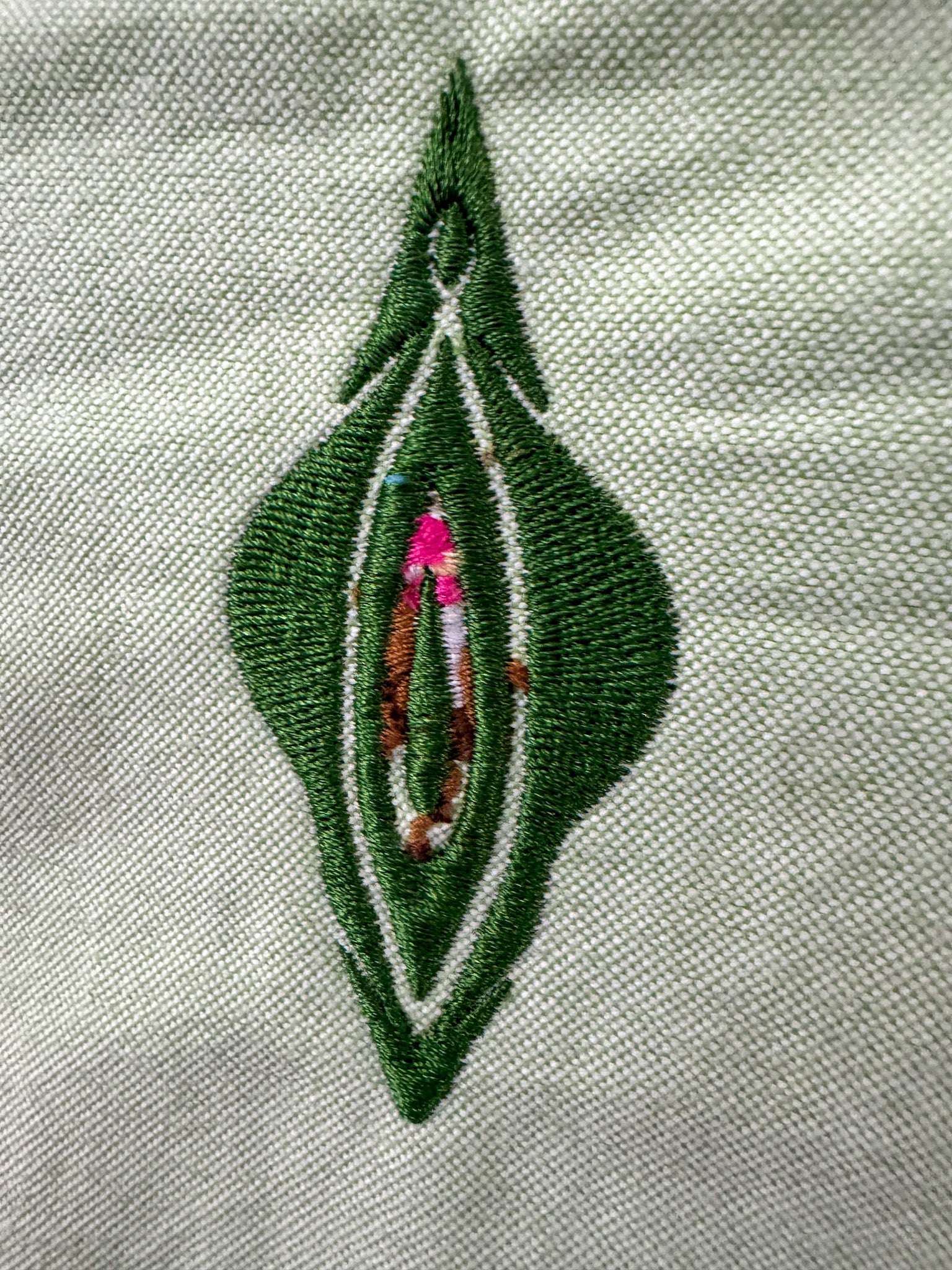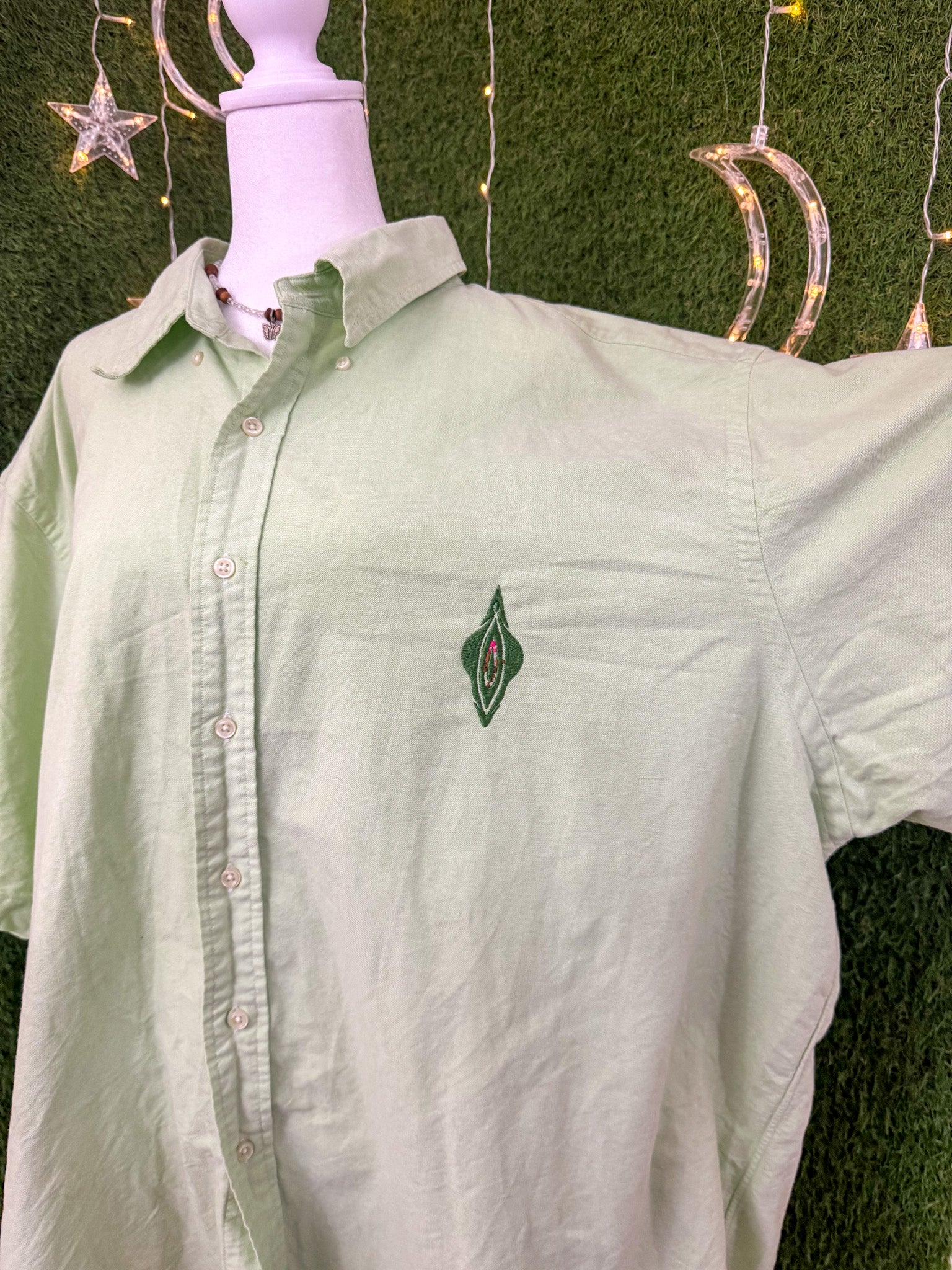 This Vulva Polo Button Up Tee is a sustainable, slow fashion piece upcycled from a secondhand garment. Featuring delicate embroidery, it supports small businesses while reducing waste and promoting eco-friendly style!