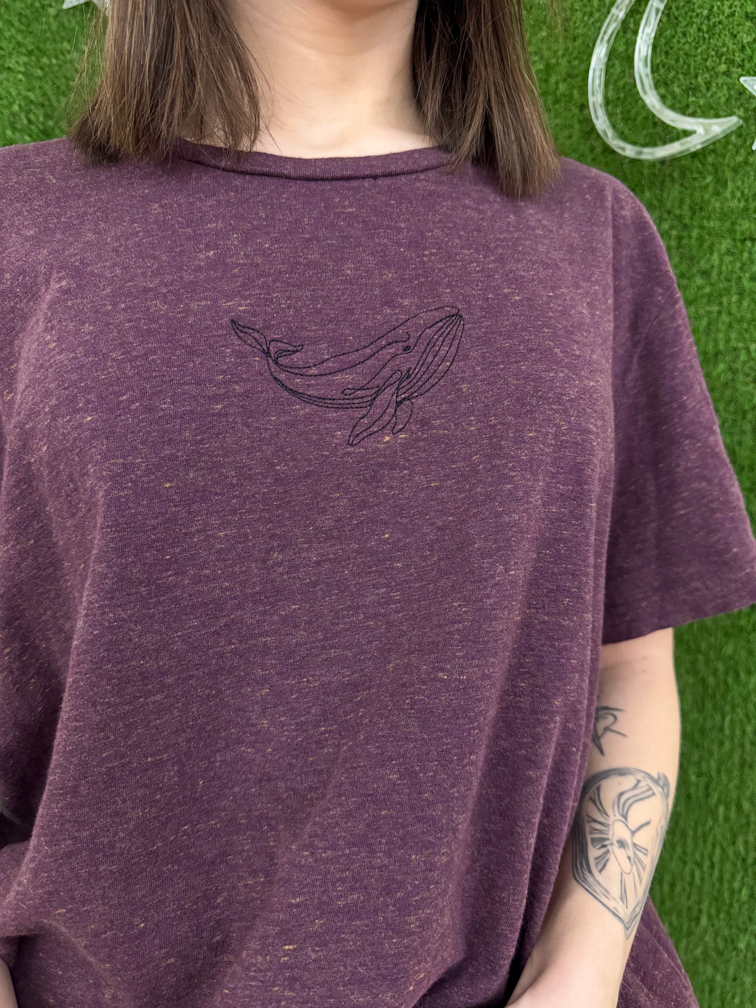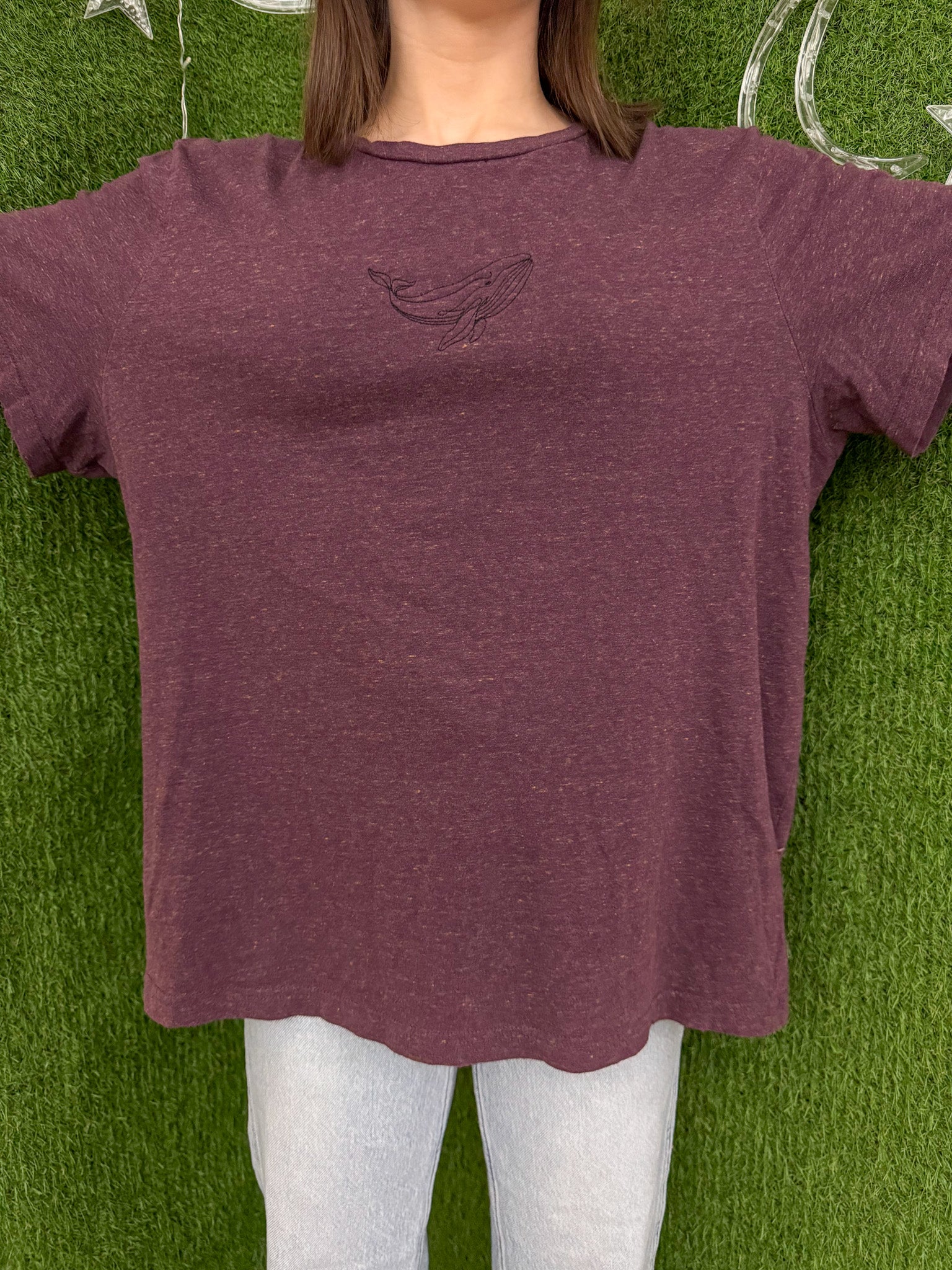 Join the sustainable fashion movement with our Whale Maroon Tee. Made from quality upcycled materials, this embroidered shirt supports small businesses and promotes slow fashion. It's not just another secondhand garment, it's a statement of style and sustainability<3
