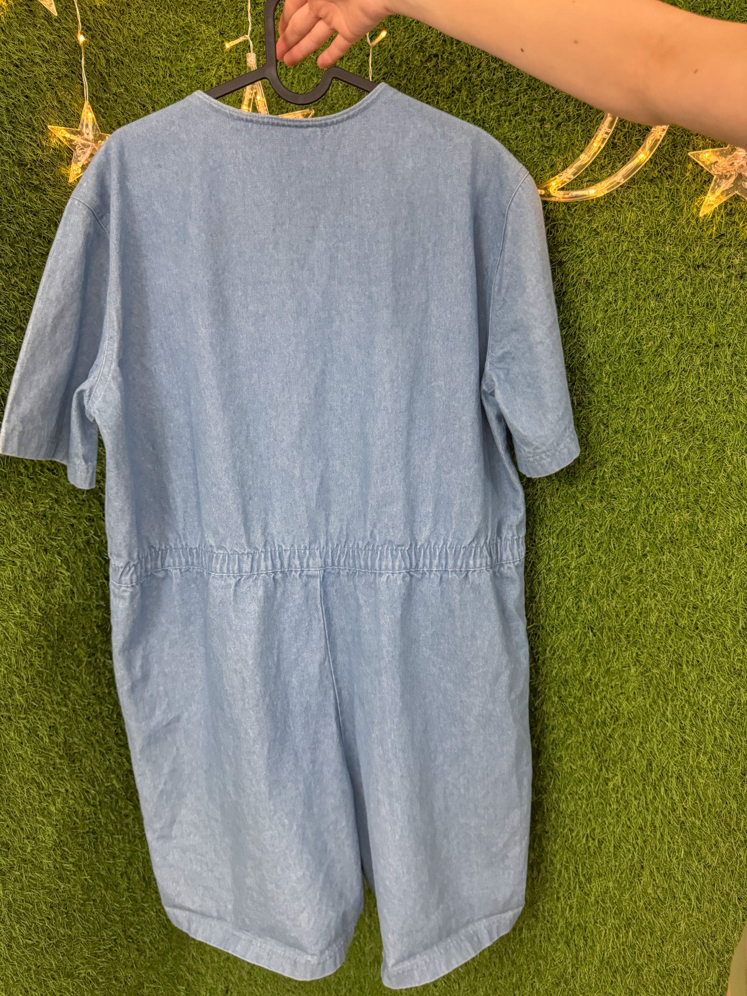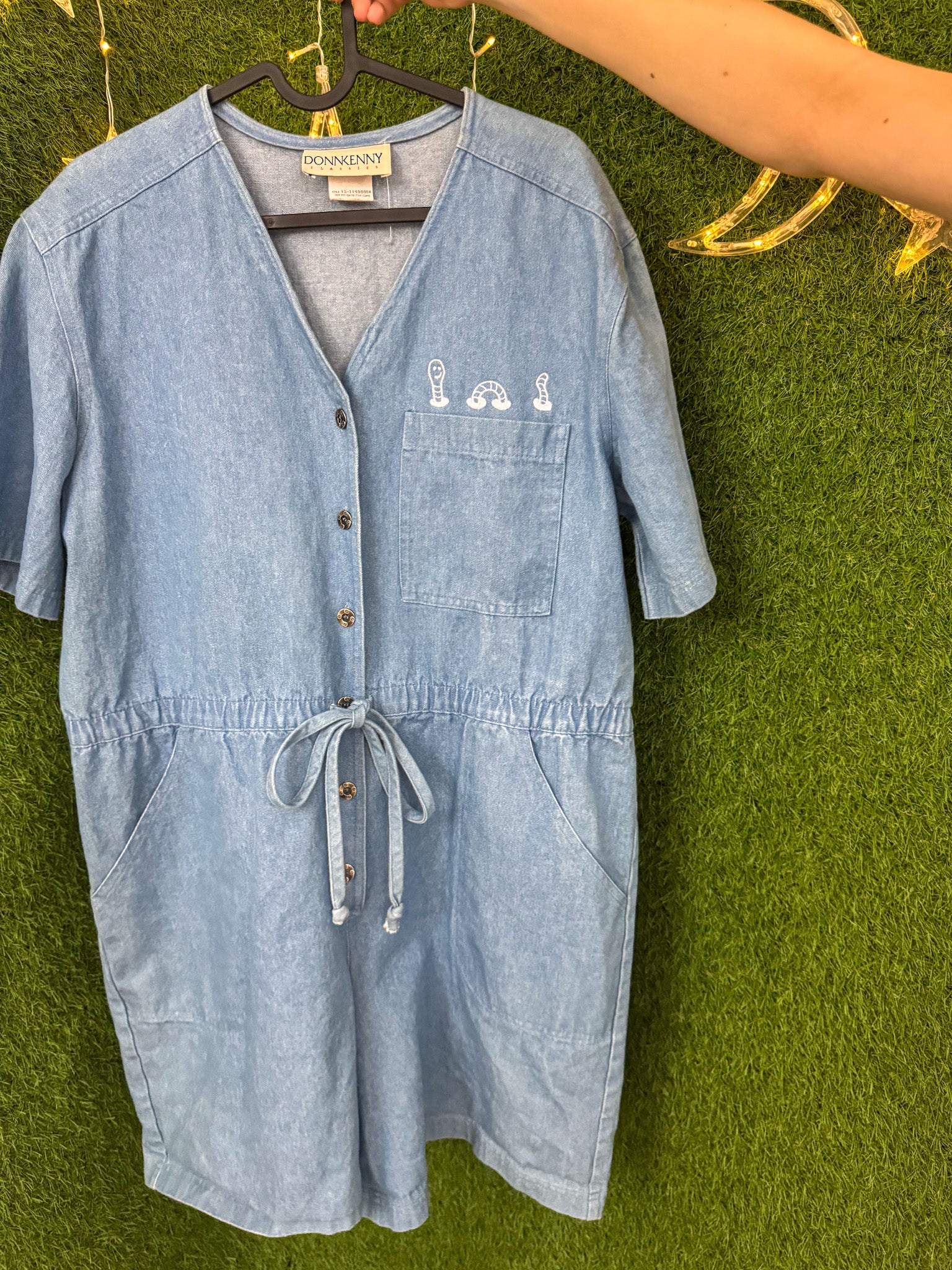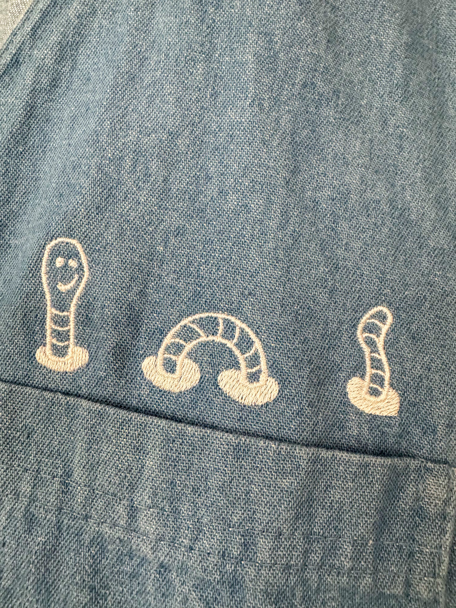 Introducing our Worm Denim Romper! Made with embroidered details and crafted from upcycled materials, this secondhand garment supports our small biz and promotes sustainable and slow fashion. Elevate your fashion game while being eco-conscious!