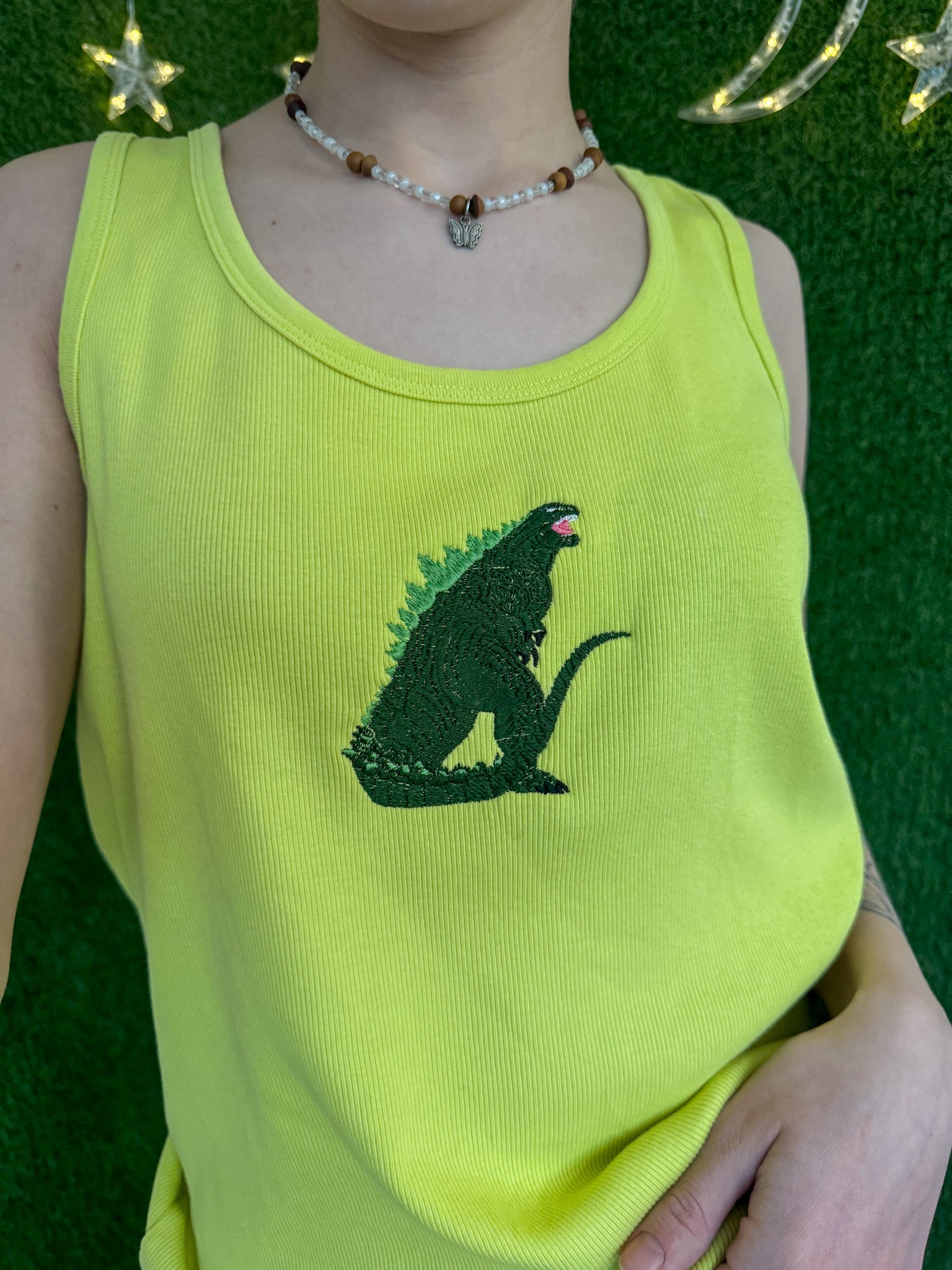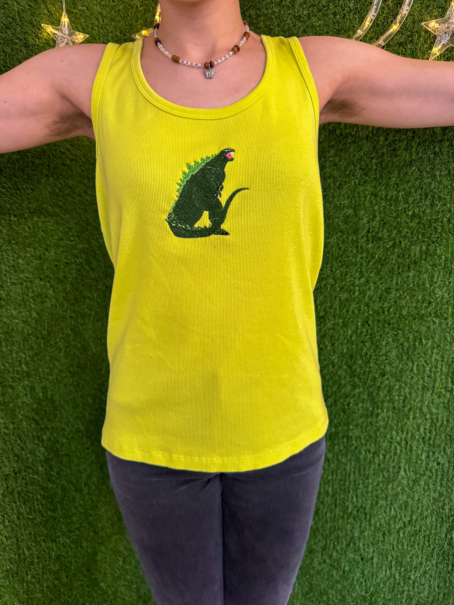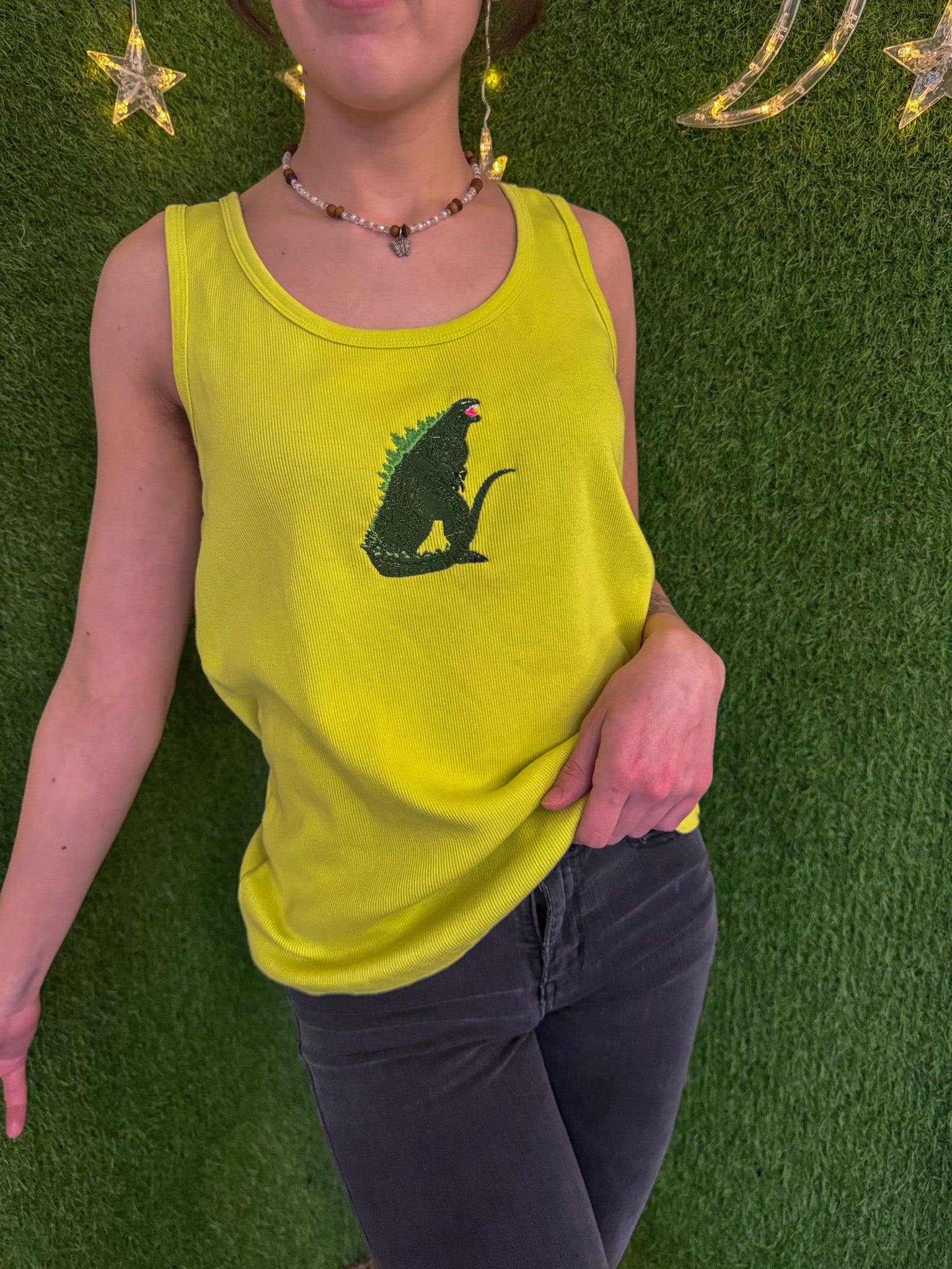 The Yellow Godzilla Tank is more than just a trendy addition to your wardrobe - it's a statement for sustainability. Upcycled with on a secondhand garment, this top not only supports our small biz, but also promotes slow fashion. Plus, with its embroidered detailing, this tank adds a unique touch to any outfit!