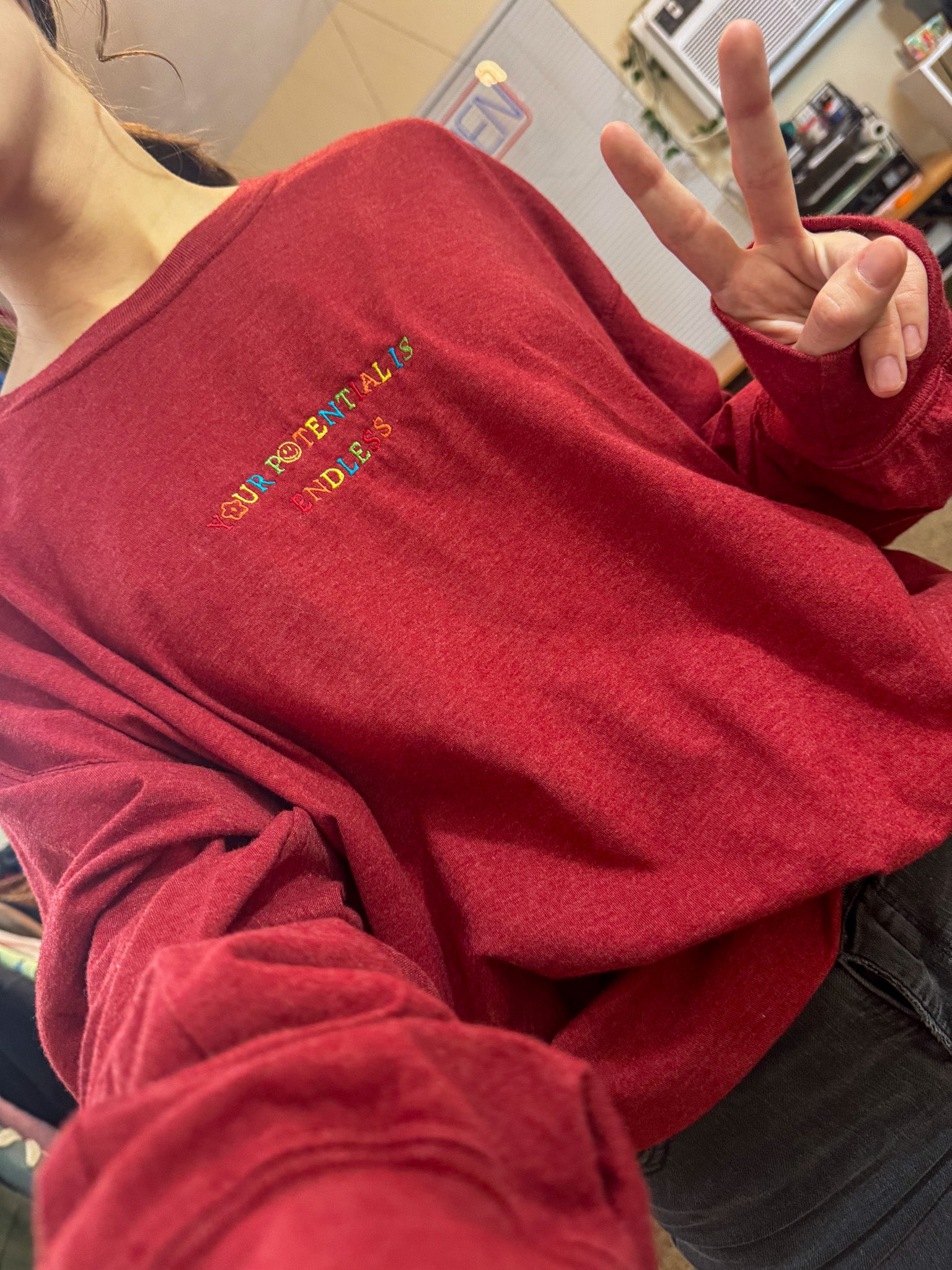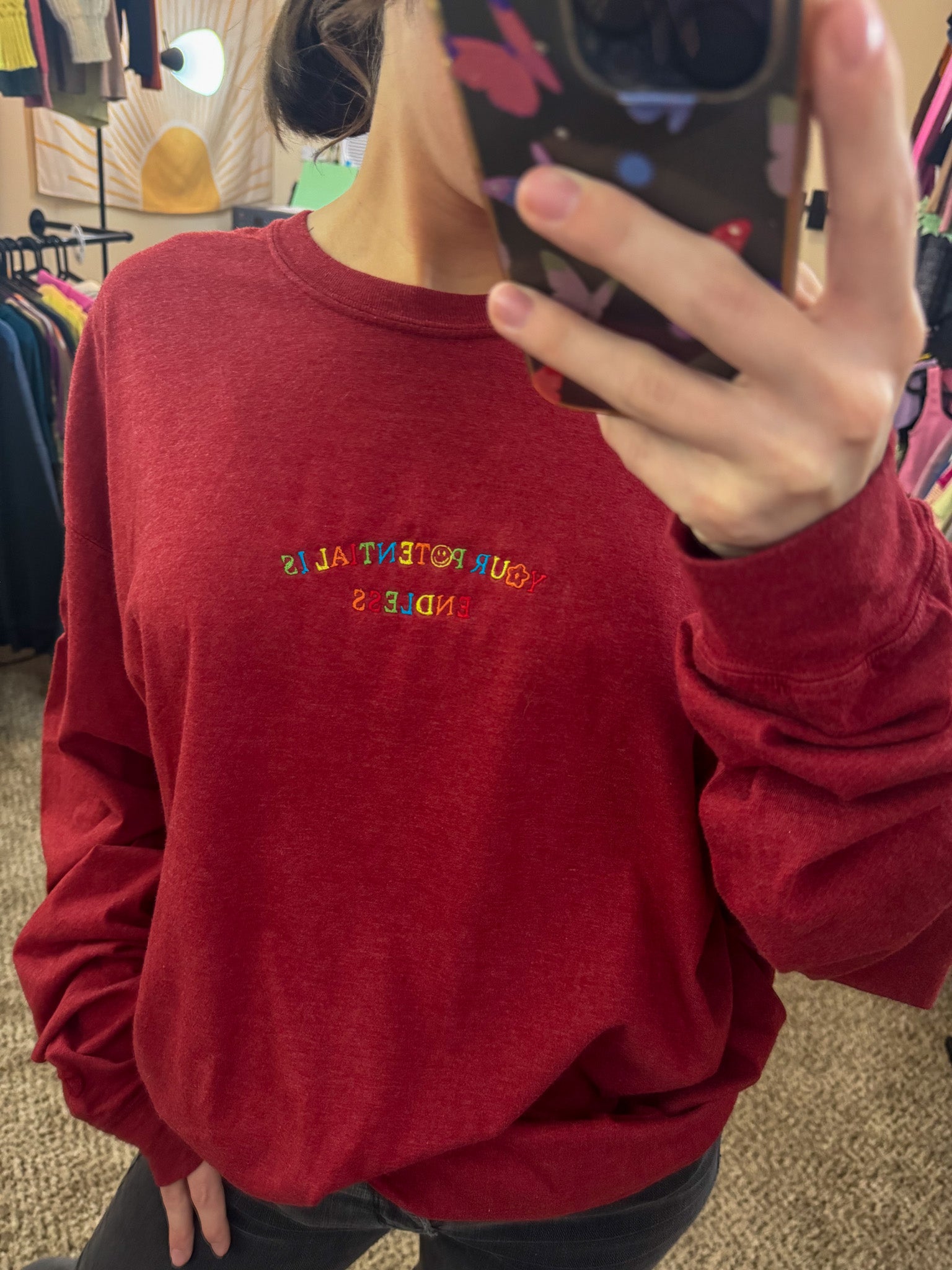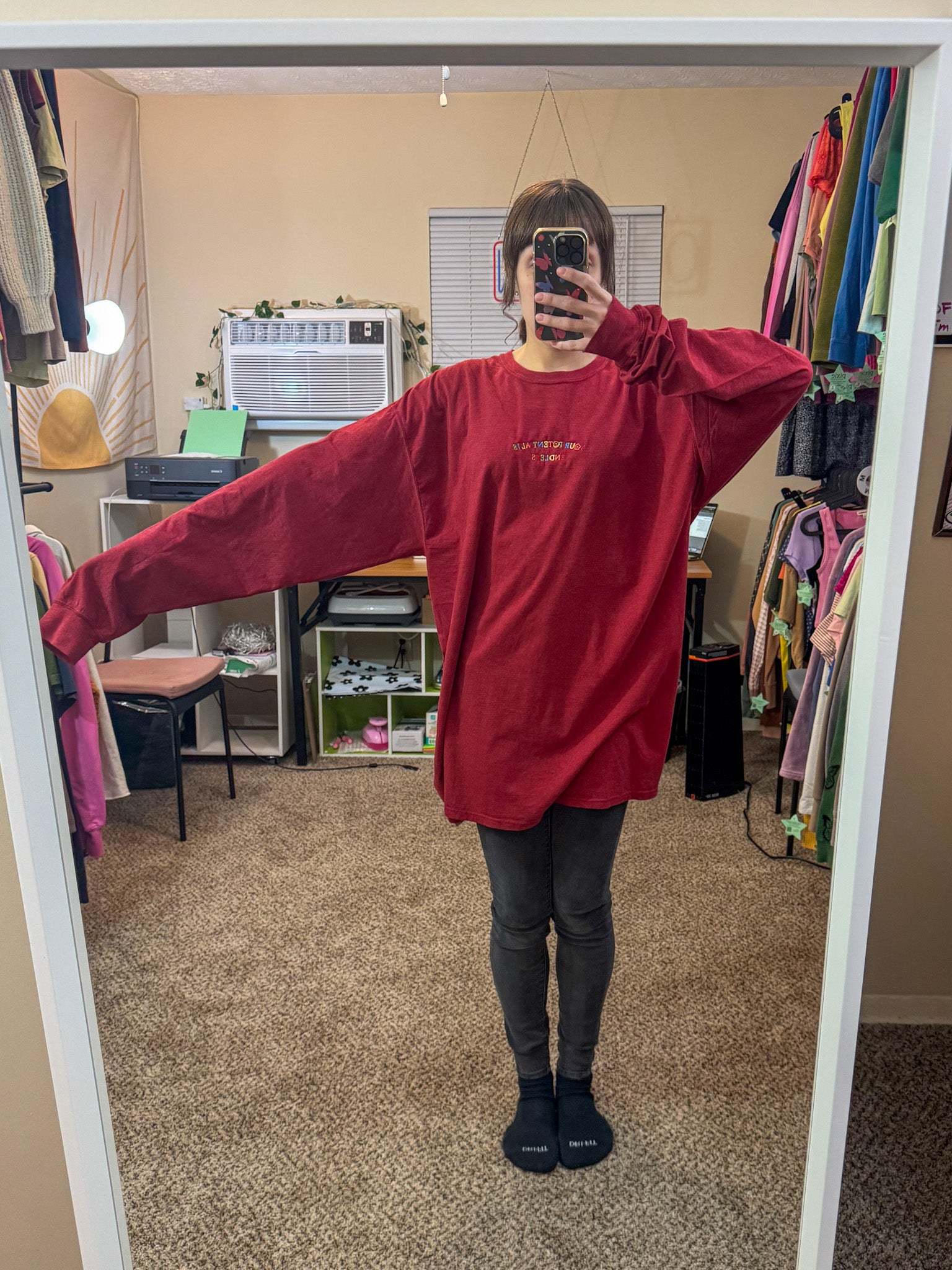 Unleash your potential with this red long sleeve shirt, embroidered and upcycled by our small biz. Join our sustainability movement and embrace the slow fashion trend. Don't miss out on this unique, discarded secondhand garment that supports a good cause!
